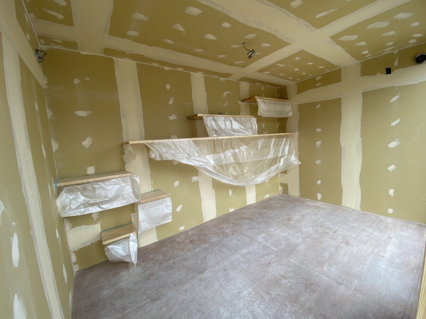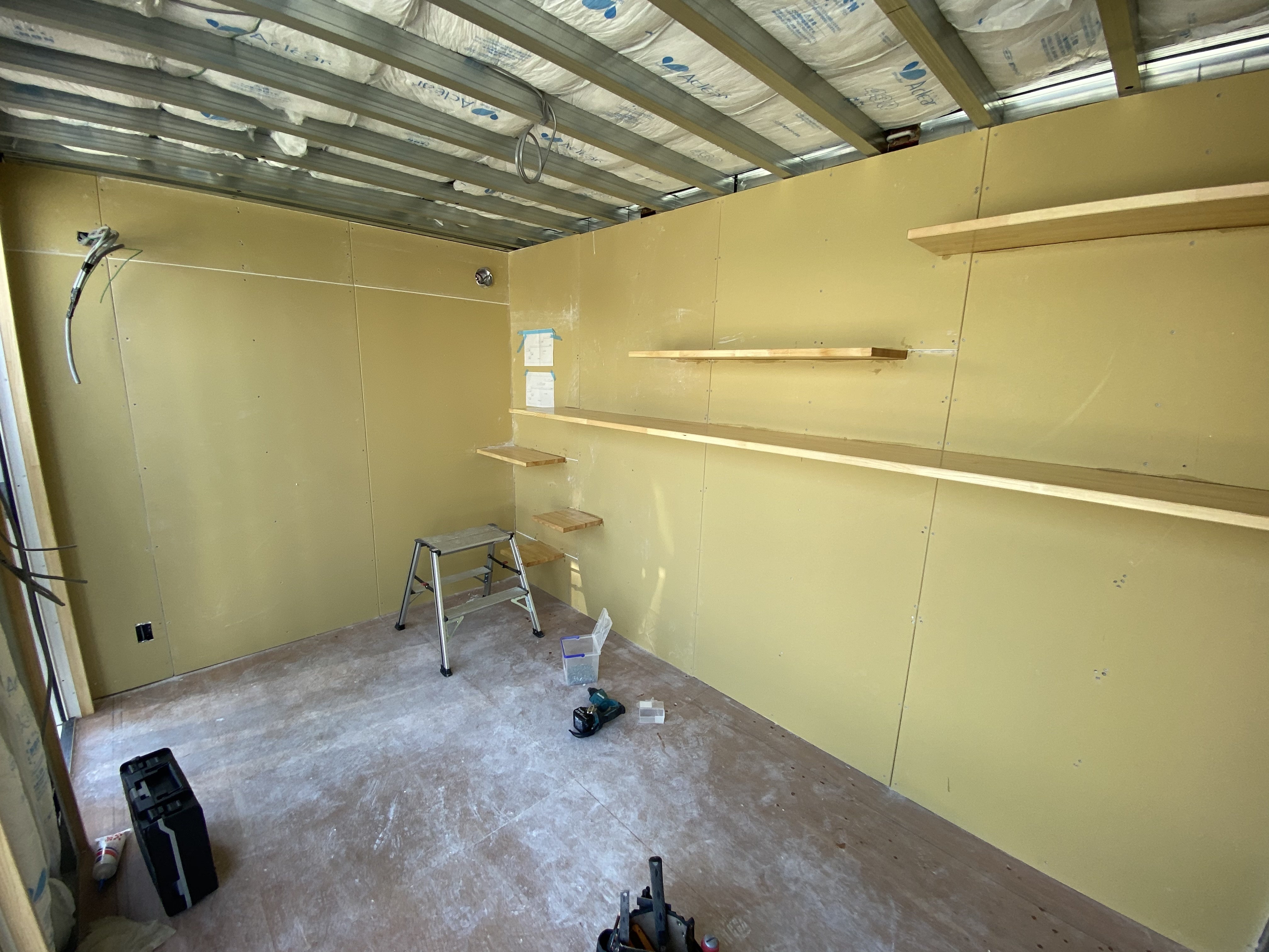 さて、内装工事ですが、壁の下地張りが完了したところで、一旦ストップです。