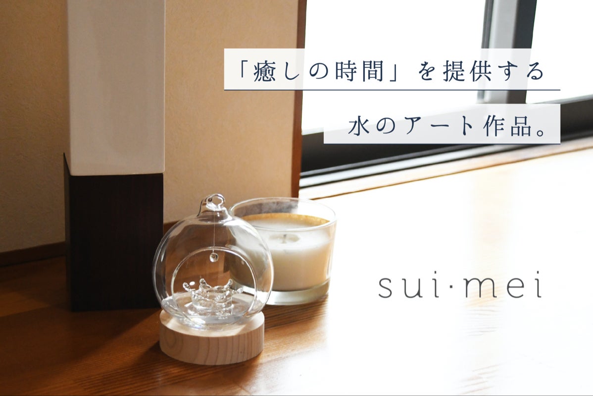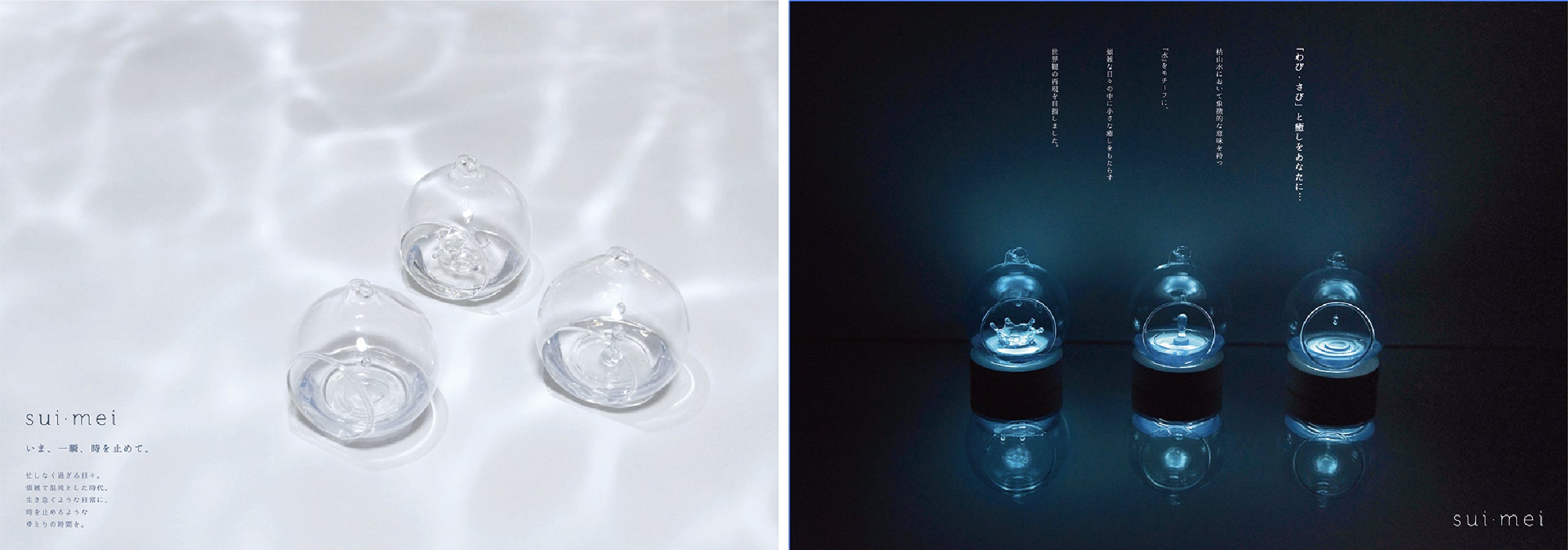 <作品名>「sui・mei」は風景の美しさを表す「山紫水明」から取りました。「水明」は”澄んだ水が光で美しく輝いて見えること”という意味があり、加えて、”水が命あるように表情を変えること”を喩えて水の命、「水命」という造語も当てて、2つの意から英字で「sui・mei」としました。
