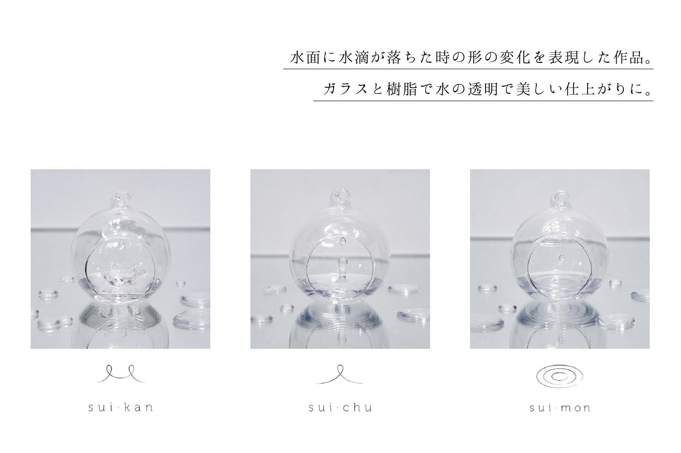 形は3段階あり、水面に水滴が落ちた瞬間にできる冠状の「sui・kan」、波の反動で柱状に隆起する「sui・chu」、その形が崩れて複数の波が円状に広がる「sui・mon」をそれぞれ制作しました。