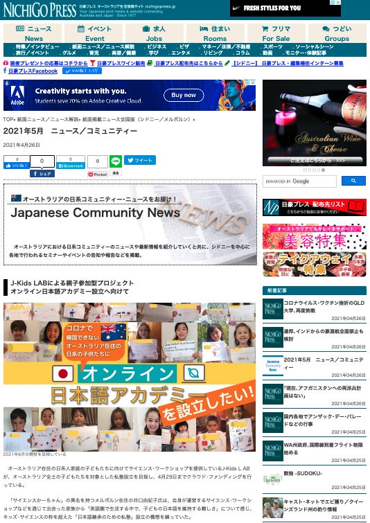 オーストラリア最大の日系メディア「日豪プレス」、本日4/26発行の5月号に本プロジェクトが掲載されました。紙面、Webサイト両方に掲載されています!(紙面は私もまだ見ていません)