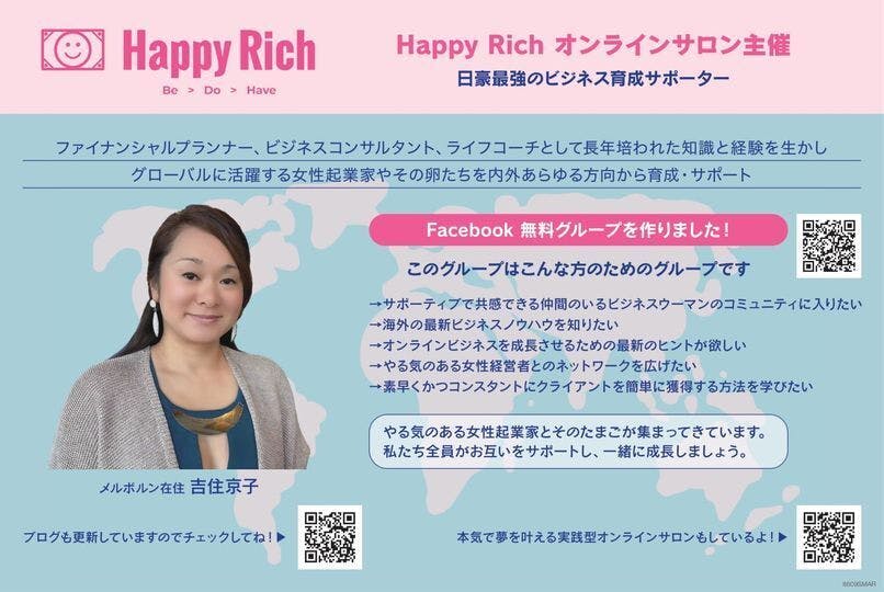 日豪最強のビジネス育成サポーター吉住京子がファイナンシャルアドバイザ、ライフコーチ、ビジネスコンサルタントとして長年培われた知識と経験を活かしグローバルに活躍する起業家やそのたまごたちを内外あらゆる方向からサポートするグループを始めました。