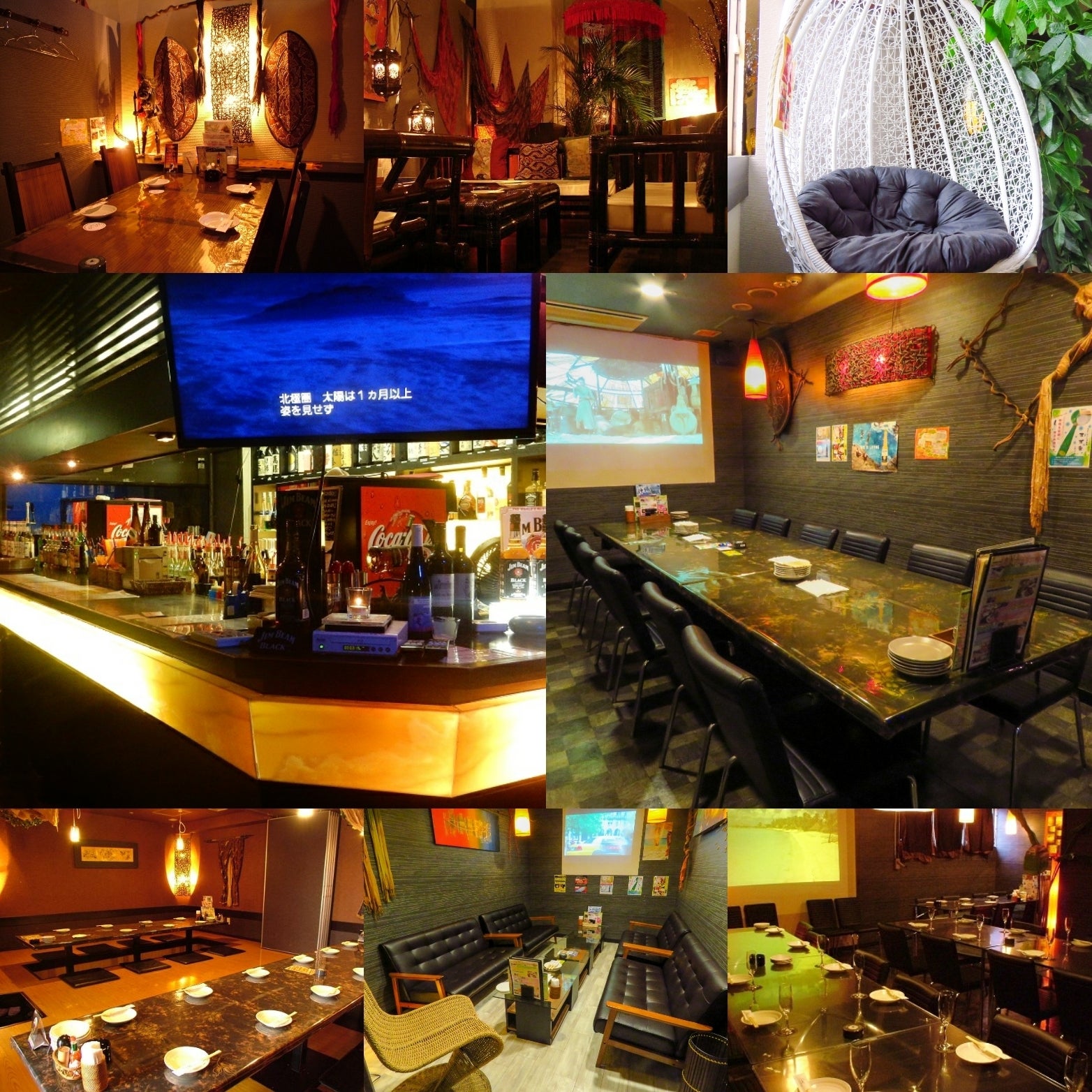 空間は先代の社長がこだわったバリ家具を使用したテーブル席、ソファー席、お座敷、掘りごたつ席に加え、プロジェクターやブランコのソファーがある席もございまして【お客様に選ぶ楽しみ】を与えたくこのような作りになっております。