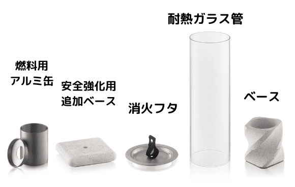 もし、確認前に火をつけてしまい、消火できない状況になった場合は、上記の方法、もしくは直接、缶にフタを被せると火はすぐに消えます。ただし、ガラス管はとても熱くなっていますので、ガラス管をベースから取り外す時などは、ミトンや鍋つかみなどを使い、ベースを倒さぬよう、火傷に充分に気をつけて作業してください。