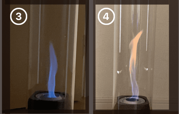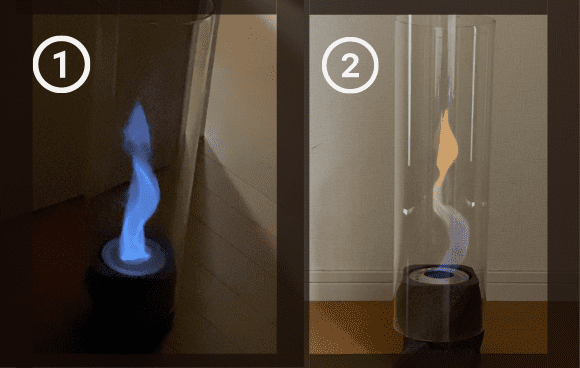 例えば、「バイオエタノール84%、水12%」などの燃料は赤(オレンジ)の炎で、「メタノール70%、エタノール30%」などは青い炎になりました。お好きな色でお楽しみいただけますが、青い炎は明るいところでは見えにくいのでお気をつけください。