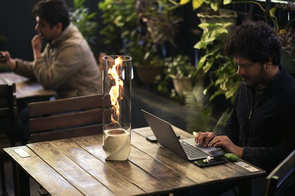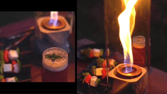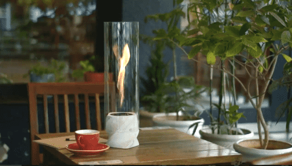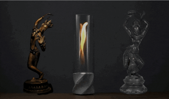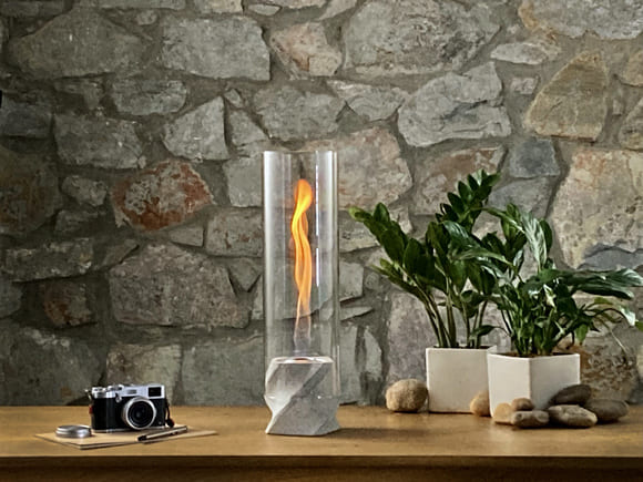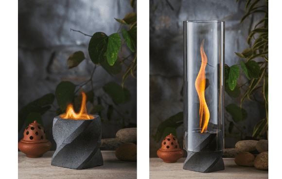 MENKAは、本物の炎がチューブの中で渦巻く独自構造のファイヤーランプ。室内での常設は勿論のこと、各素材は分離可能なのでアウトドアでの持ち出しも容易です。