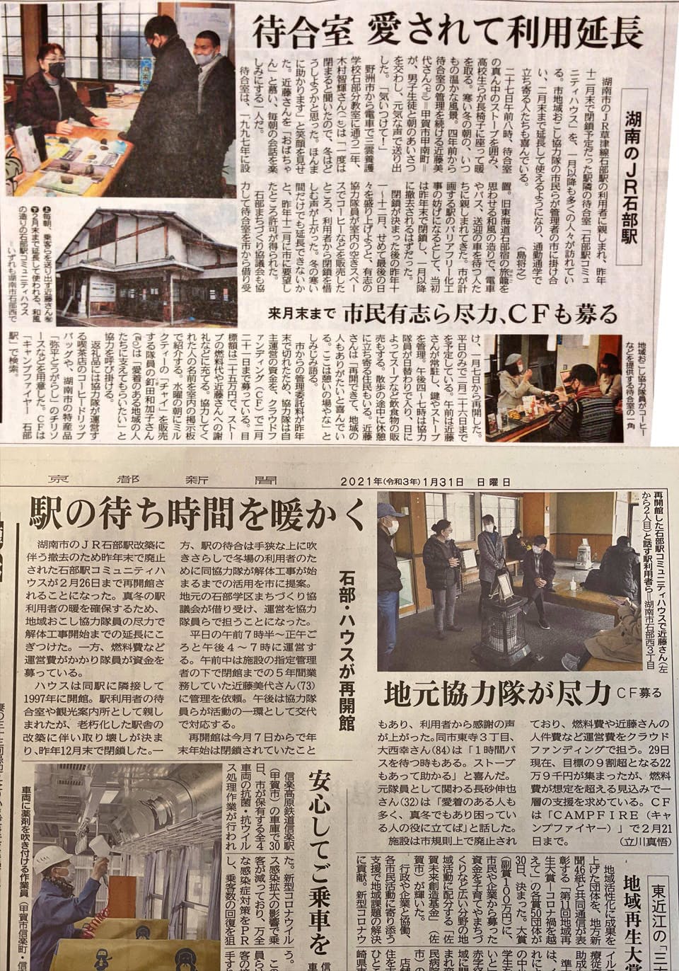 2021/01/31 11:18石部駅コミュニティハウスでの取り組みが、新聞にてご紹介いただいてます!寒い中取材に駆けつけてくださった記者さん、取り次いでくれた協力者の方に感謝です。こうして記事になると、改めていろんな視点で活動の意義や影響を感じれるので、とても励みになるし勉強になります。普段直接お話を聞けないような人の声とかも含めて。うれしいです。このクラウドファンディングでは、この記事の投稿時点で達成まであと"4000円"というところまで来ていて、ホッとしていますが、実はここからが本番と思ってます。【クラウドファンディングを選んだ理由】資金が必要なのは間違いなかったし、短期間で多くの人に知ってもらうには、WEBというインフラを活用するのが最適。でも、それだけがクラウドファンディングをした理由ではありません。みんなの支援で"ちょっと先の未来"を明るくするそれを町の人、ひいてはこの取り組みが目に届く、世の中の人達に伝えたかったからです。そして実際に動いて欲しかったからです。この石部駅のことだけじゃなくても、ご自身の身の回りのことであっても、です。とにかく先が見えない時代で、それでも"今動く事"で"ちょっと先の未来"が明るくできる、そんなアイデアのきっかけになればと思ったからです。今、たくさんの人が動いてくださってます。まだまだ増えていっています。本当に嬉しいです。このハウスは、工事が始まればいずれ無くなりますが、「ただの思い出」にはしません。ここでの取り組みをきっかけに、町の中での新しい場所、仕組みづくりを考えていこうと模索しています。それには皆さんのご支援、ご協力や、まだこの取り組みを知らず、けど知っていたら動ける!という方達の力が必要になってきます。引き続きの応援を賜るとともに、地域おこし協力隊や有志市民メンバーのこれから動きを、是非見守って、広めていただけますと幸いです。もちろん参加希望の方はいつでも大歓迎!よろしくお願いします! もっと見る