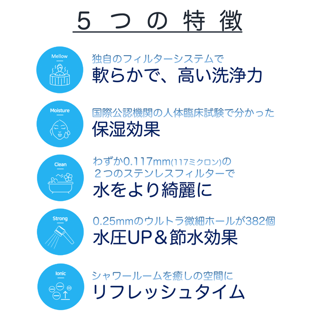 イオンスパは、単に洗うだけではなく、より優しく、綺麗で、健康的な水でシャワーを浴びようという考えのもと、以下の特徴を持って作られました。