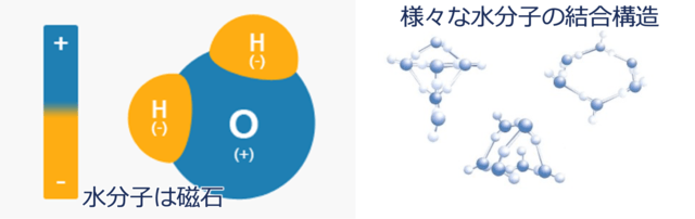 水の分子をなす水素 - 酸素 - 水素の結合は、104.5°の角度をなしており、曲がった形に見えます。水の分子のこのような不均衡構造のために、酸素は負電荷(-)を持つようになり、水素原子の方は正電荷(+)を持って磁石のような性質を持つようになり、これを「極性」といいます。水のこのような極性によって、水の分子は互いに結合して大きな塊を作ることができます。この時、使用されている別の水の分子との間の酸素 - 水素間の結合は「水素結合」と呼ばれ、我々が水に触れ、見ることができるのは、水素結合のお陰です。水の分子は空気より軽く、互いに結合されていない場合、常温では、気体になって、すべて飛んでしまうことになります。