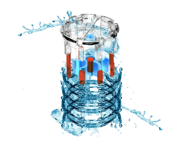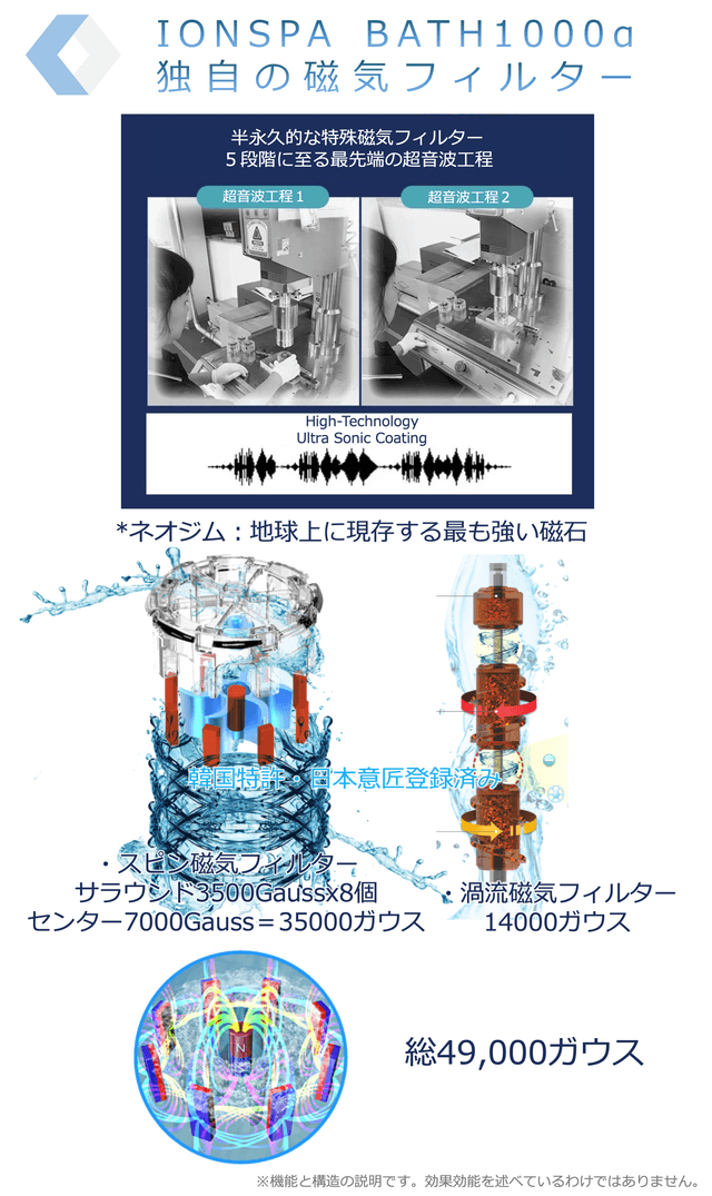 ウルトラ・ソニックを利用した特殊な製造技術によって合計49,000Gauss相当の強力な磁力を誇るイオンスパ独自の磁気フィルターが作られます。ヘッドの部分に入っているスピン磁気フィルターは1,800RPM、つまり1秒当たり約30回転しながら水を回します。