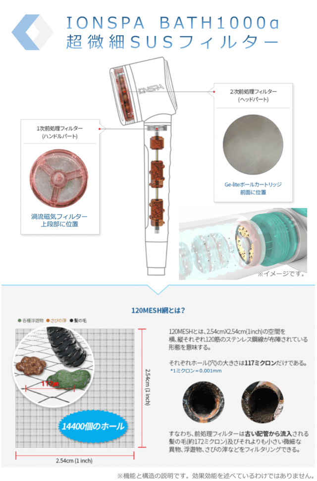 イオンスパには、わずか0.117mmの無数の穴がある2つのステンレスメッシュフィルターが入っていて、サビや僅か髪の毛の細さ程度の小さな各種の不純物を取り除いてくれます。