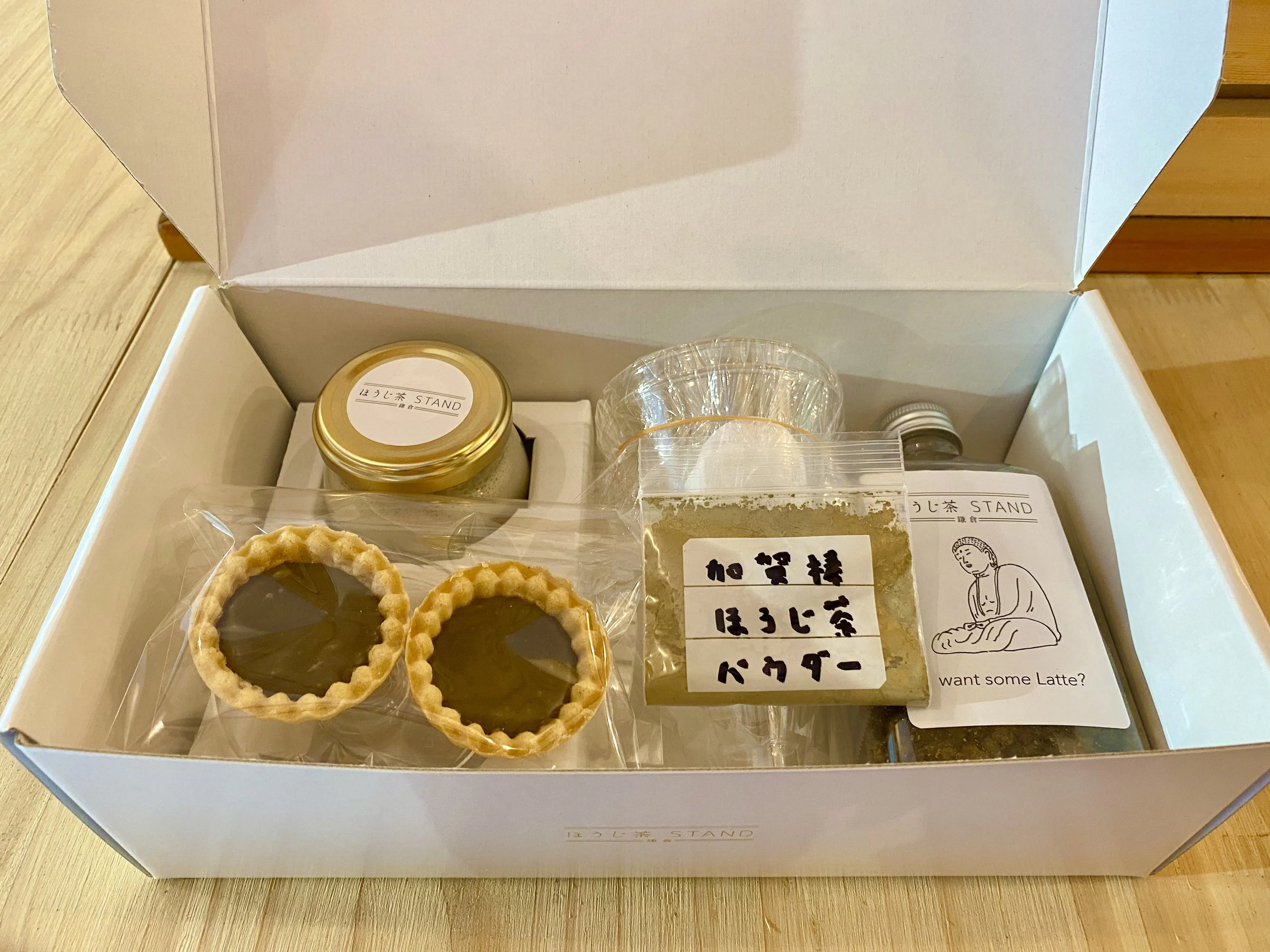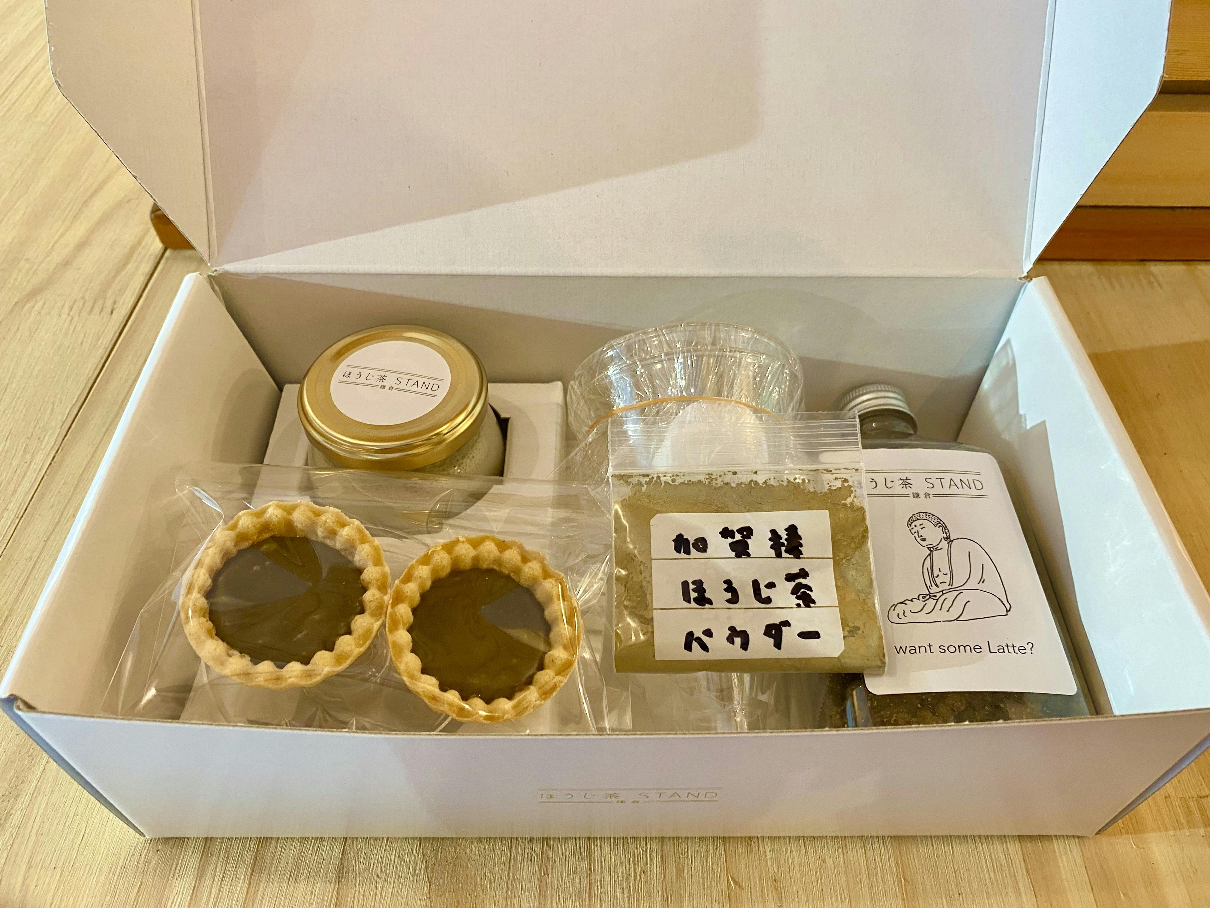 セットはこのような形で届きます。瓶に入ったほうじ茶プリン、ラテボトルに入ったほうじ茶クッキー、ほうじ茶生チョコタルト、加賀棒ほうじ茶パウダー、パフェ容器&説明書が入っております。このセットによりお家でほうじ茶パフェを2つ作ることができます。