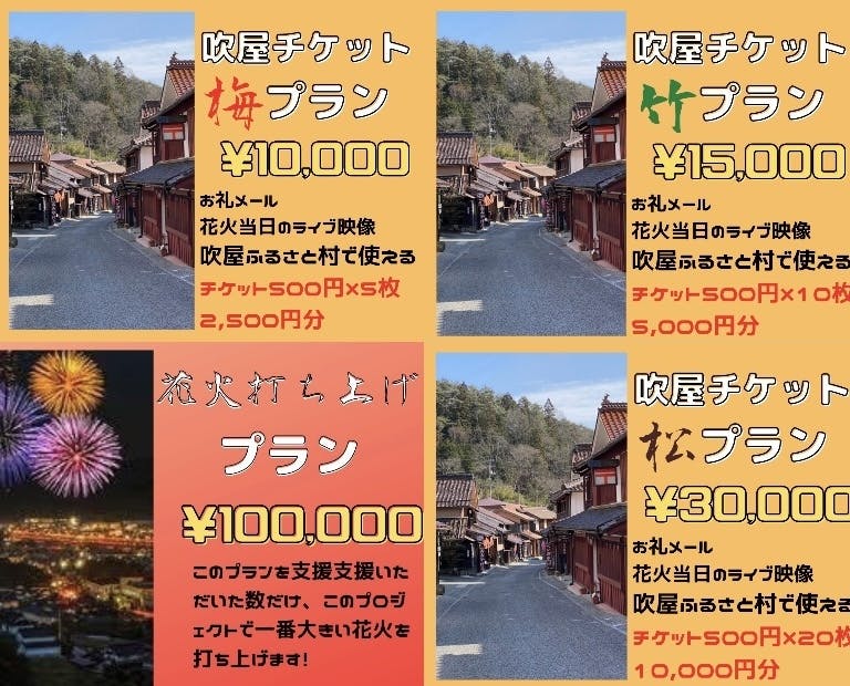 なんと、100.000円のリターンとして5号玉の花火を打ち上げれます!今回のプロジェクトでは、4号玉が最大の大きさです!5号玉を打ち上げて、あなたの花火にしませんか?