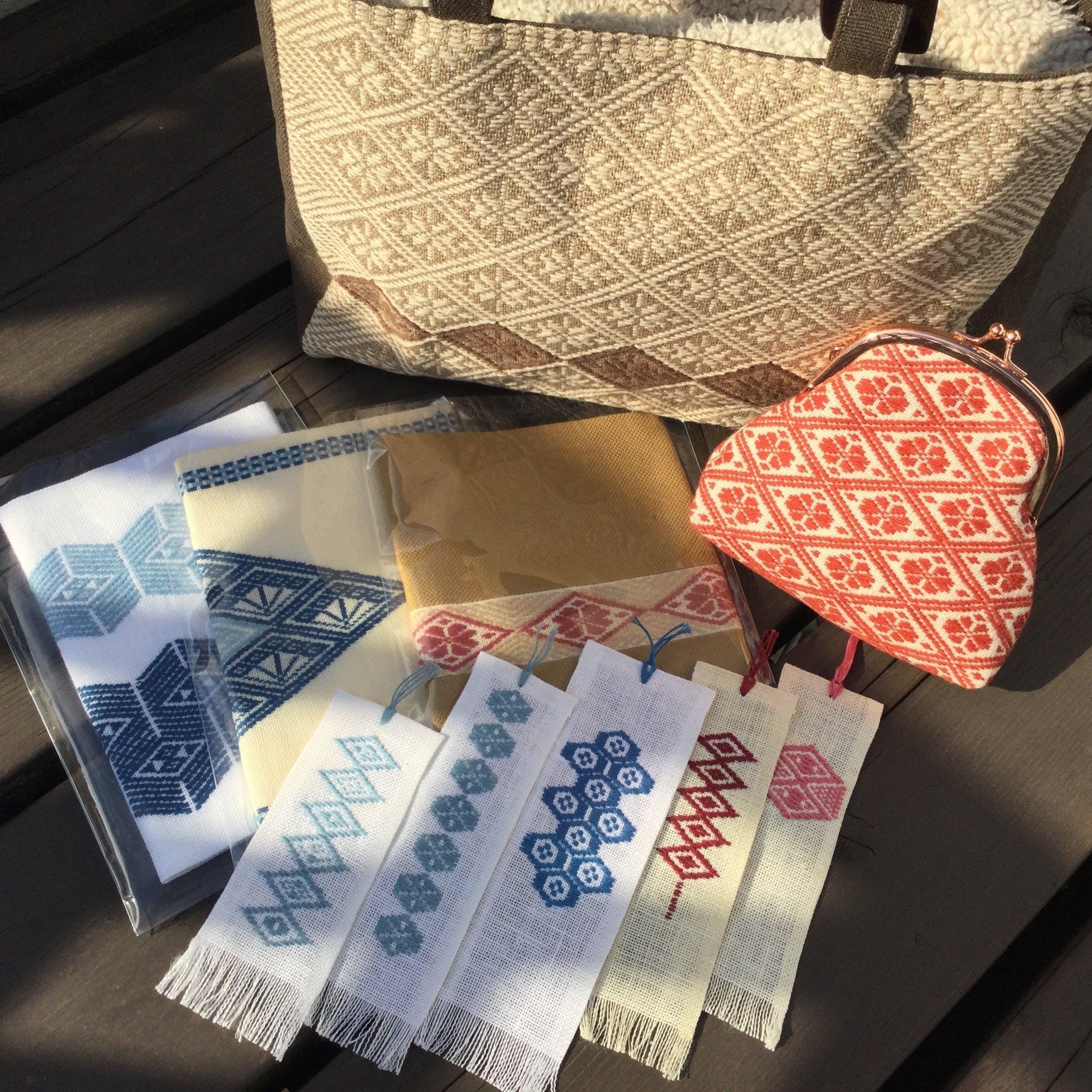 今回は、次の7点を用意しました。バッグ1点、テーブルセンター2点、ポーチ3点、カフェエプロン1点です。いずれも、1点につき、1枚の「しおり」をお付けします(柄はお任せ)。