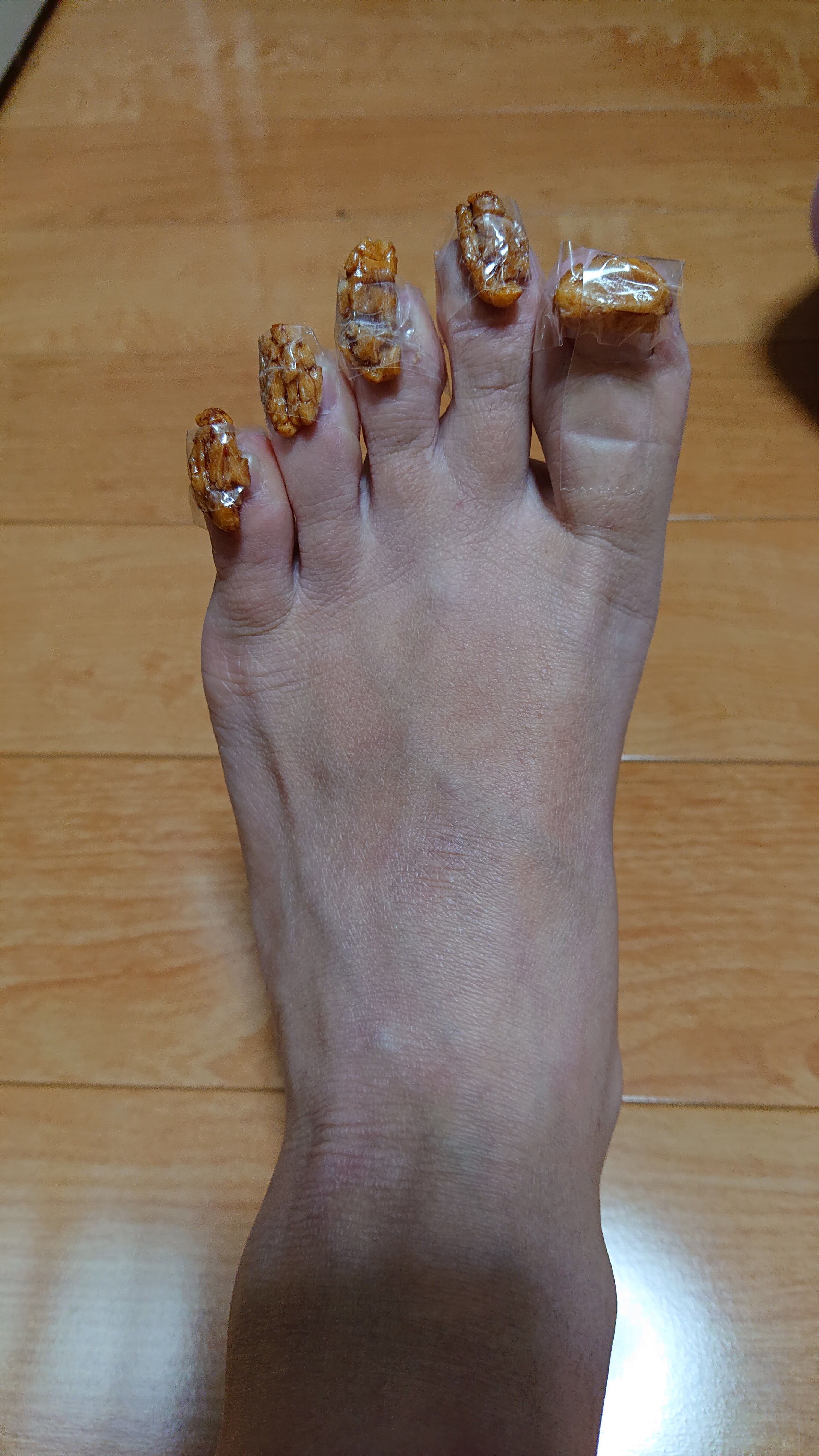 爪に小石のような異物が乗った状態で靴下と靴を履いて歩くということはどういう状態なのか、自分でも体験してみようと思い、賞味期限切れのあられを足の爪に貼りつけて靴下と靴を履いて歩いてみましたが…。痛く痛くてとてもまともに歩ける状態ではありませんでした。