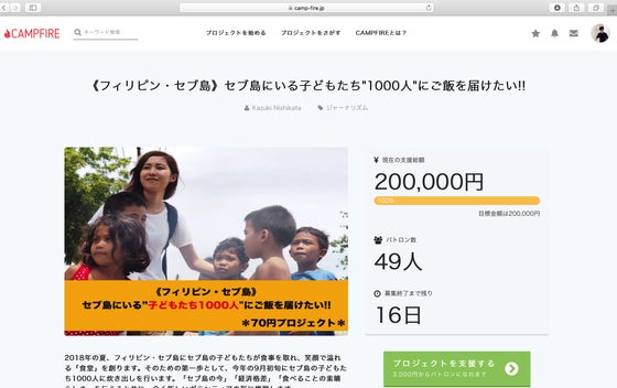 2017/08/04 20:31【たった1週間で目標金額達成しました!!!】 かねてより皆様にご支援頂いておりました70円プロジェクトのクラウドファンディングが、オープン開始からたった1週間で、目標金額達成しました!!! セブ島の子どもたちを笑顔いっぱいにしたい。お腹いっぱいにしたい。その思いで突っ走って来ました。 皆様のご支援のおかげで、子どもたちに美味しいご飯を届けられそうです。 今回1000人の子どもたちに炊き出しをする予定ですが、2000人、5000人、10000人とより多くの子どもたちを笑顔にするにはまだまだご協力が必要な状況です。 今回の目標の20万円に満足せず、より多くの子どもたちを笑顔にするために、より多くのご支援をいただければと思います。 すでにご支援いただきました皆様、投稿の拡散をしてくださった皆様、本当にありがとうございます。 また、引き続きパトロンを募集しておりますので、一度ページ見て欲しいです。 見るだけでいいです。そこで何か熱い想いが芽生えたら、ご支援いただきたいです。 皆さんとともに子どもたちをお腹いっぱいにできる日に向かって引き続き頑張っていきます!!! 応援よろしくお願いいたします !!! もっと見る