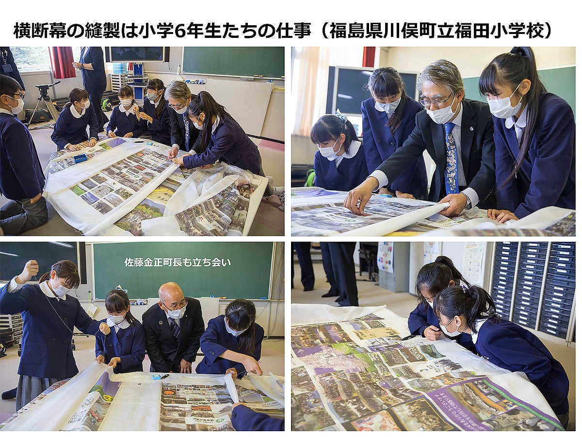 復興10年を語る写真等は、福島県川俣町産の薄い絹布に高精細印刷し、同町の福田小学校6年生たちが縦1m横7mの横断幕に縫製してくれました(卒業記念制作だそうです!)。