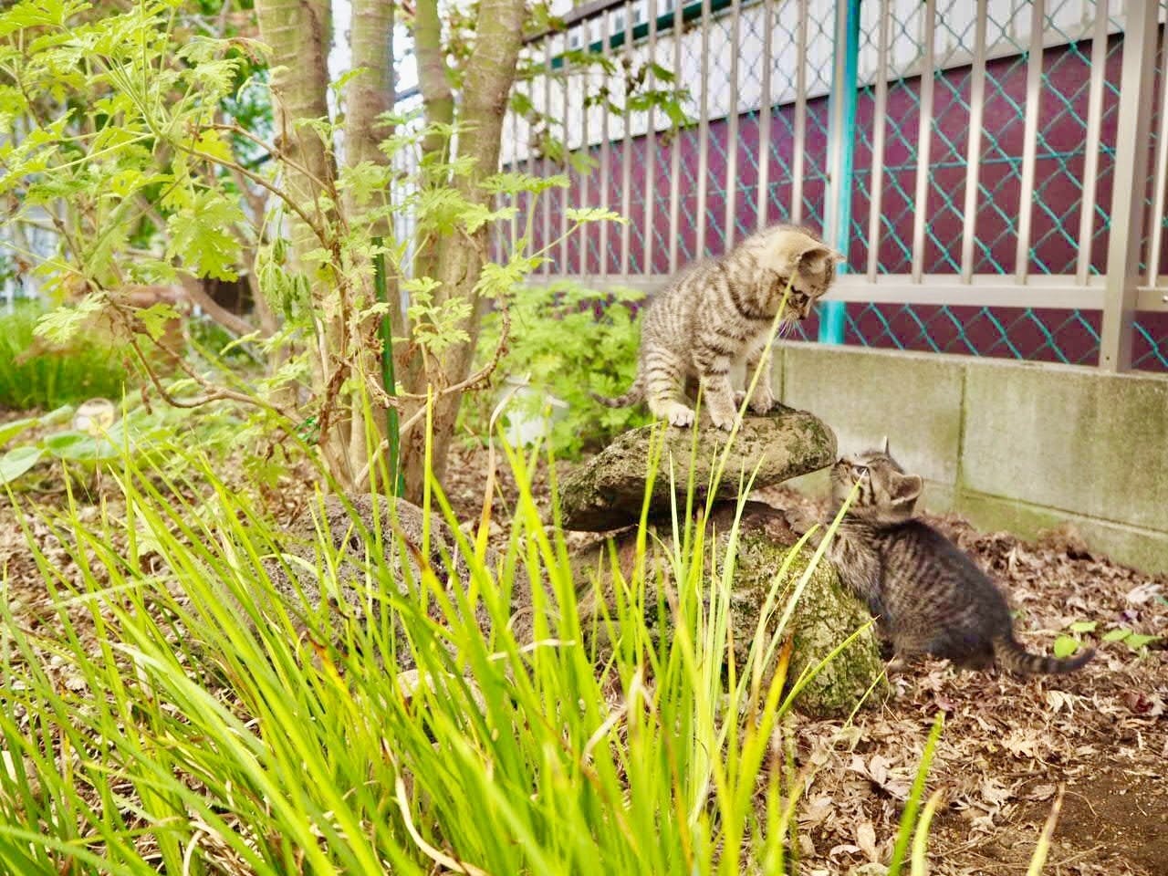 子猫のいなくなったお庭で1人どこに行くこともなく、庭に座り込んでいる姿に心が痛みました。