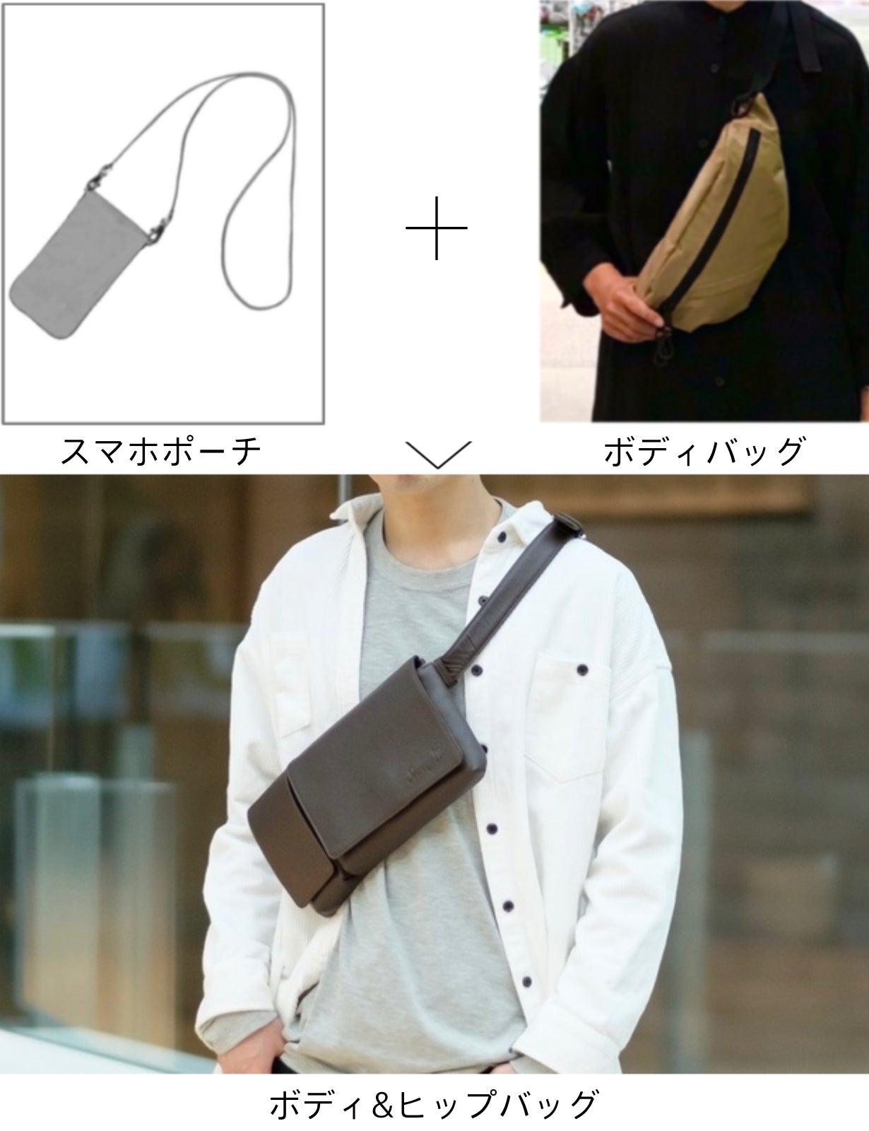スマホポーチとボディバッグを1つにした新しいデザイン!必要なものをスマートに取り出せます。