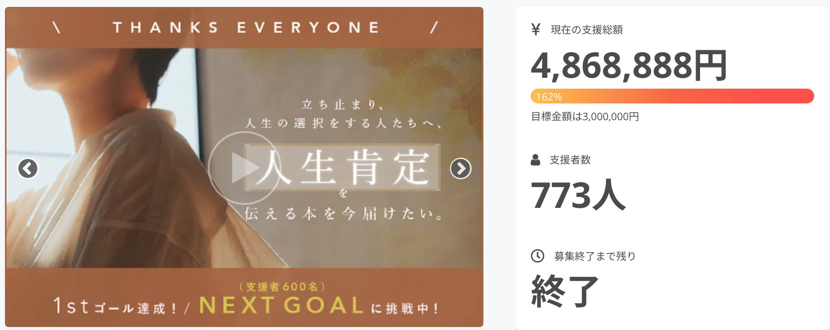 この本は、世の中にまだ言語化、浸透していない「人生肯定」という考え方を、まずは自分たちの手が届く範囲の必要としている人たちへ届けたい。そしてその輪が、人から人へ広がることで一つの温かいムーブメントになってほしいという願いを込めて、あえて出版社を通してではなく、クラウドファンディングでの自費出版/予約販売の形を取らせていただきました。