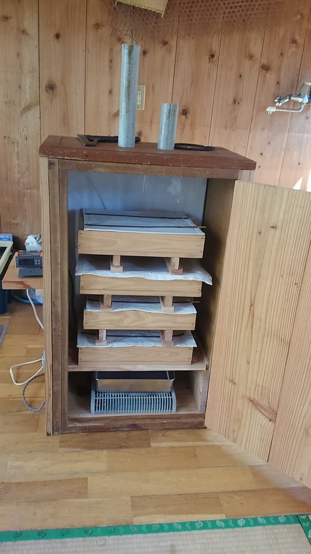 これからこの2種類の麹菌で色々なものを醸してゆきたいと考えていますが、先ずは主人の作る天日塩で他にはない塩麹を商品化したいと思っています。 そして商品化するにあたり麹作りの道具達を種子島の地杉を使って手作りしたいと思っています。 今までも拙いながら発酵に必要な麹蓋や卓上醤油搾り機や麹室など自由な発想で手作りしてきました。 麹室については明治 末期の酒造りの権威である野白金一先生が考案した温度による比重差を利用した自然循環換気システムである野白式麹室をオリジナルの発想で再現してみたりしました。