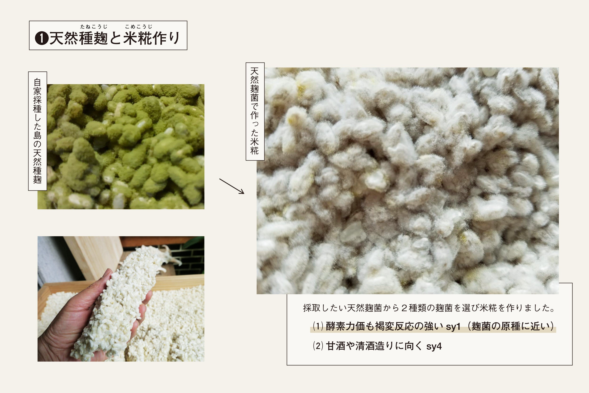 酵素力価が高いということは簡単に言うとこの麹で甘酒を作るととても甘い甘酒が出来て、塩麹を作ると素材の甘みや旨味がより強く出て肉や魚を軟らかくする力も高いということです。 そして麹は酵素力価が高いと褐変反応も高くなる傾向があるのでこの麹菌を米麹にすると白くならずに黒っぽい米麹になります。 麹の業界ではいつの頃からかより白い麹を求められるようになっていったので黒くなる麹は使われなくなってきました。 しかし、国語辞典にも女房言葉で清酒のことを『山吹』と言うと記してあるし、落語の『長屋の花見』でも『お茶の色』を酒にみたてて『おちゃけ(お酒)』というくだりがある。 昔の清酒は黄金色だったようだし、 昔は造り酒屋で酒粕が黒くなってしまった。という話しもよく聞きました。麹は美味しければ白くなくてもいいのでは? そんな想いも込めて今までにない塩麹を商品化します。 2019年11月には秋田今野さんにて種麹作りを教えて頂き、同時に選出した3種類の種子島天然麹菌から実際に米麹を作り其々の特徴を考察しました。 そして更に2種類の麹菌に絞りました。 1つは酵素力価も褐変反応の強いsy1。 もう1つは甘酒や清酒造りに向くsy4。 以来今日までこの2種類の麹菌で色々なものを醸す毎日です。