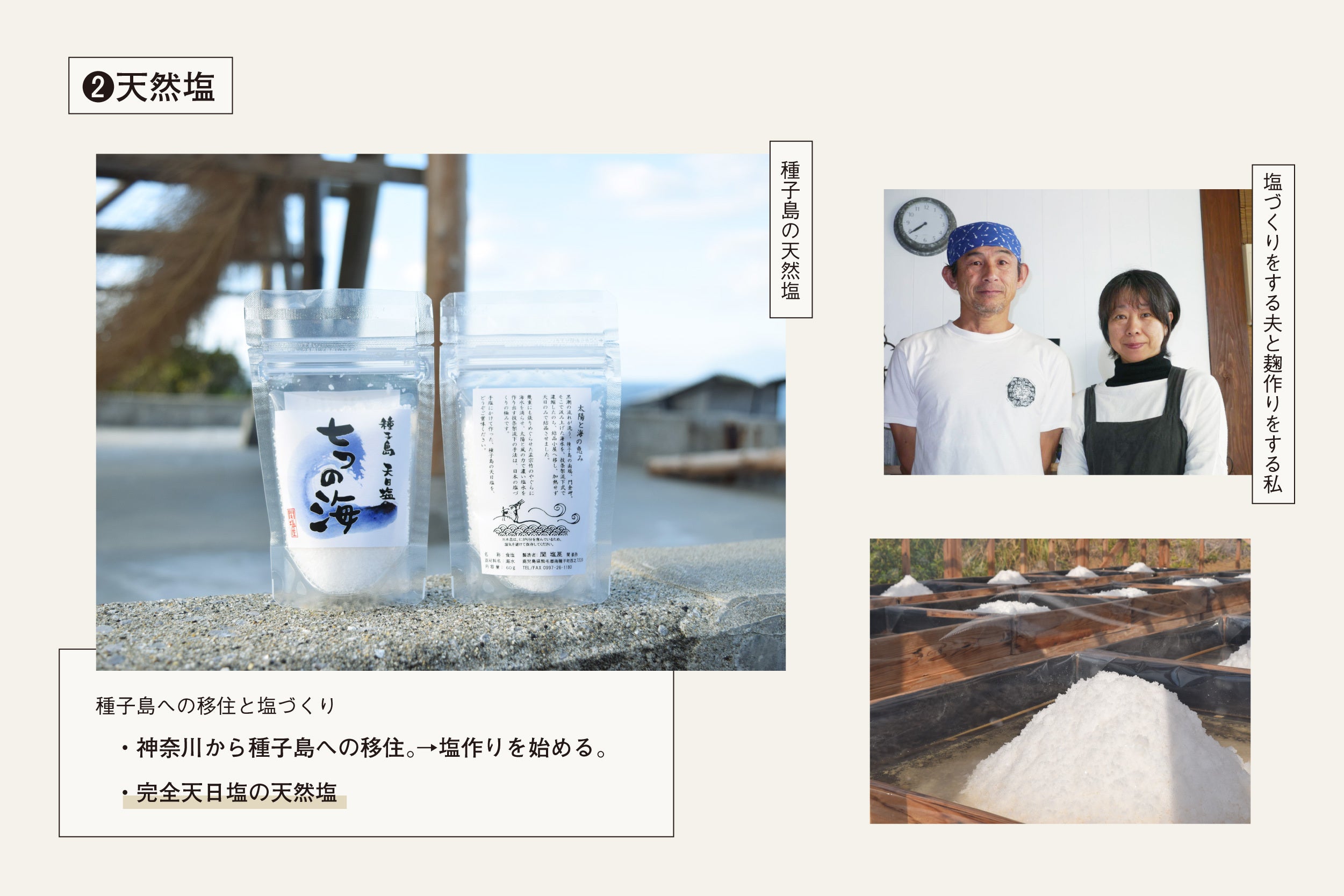 神奈川県で産まれ育ち同郷の主人と結婚しましたがその後すぐに主人が青年海外協力隊に参加。ボリビアで2年間生活し都会での生活に疑問を持ち、少しでも農的生活がしたいと住むところを探す旅に出ました。 ワンボックスカーにテントを積み込み家族4人(長男2才、次男生後6ヶ月)で5ヶ月間の旅の末、移り住んだのがここ種子島でした。 以来地の利を生かした仕事として孟宗竹を使った流下式塩田による天日塩つくりを夫婦でしております。
