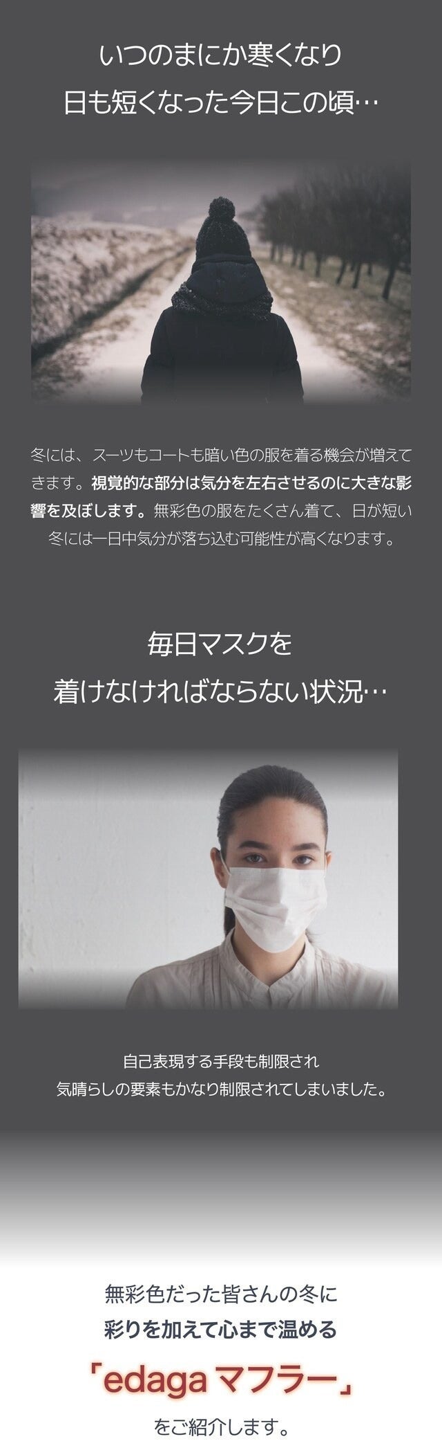 これからの季節に欠かせないアイテムでもあり、常に見えて、顔の真下に着用する「マフラー」というアイテムが、人の心にも働きかける色彩を活用したデザインを施すのに適していると考えました。