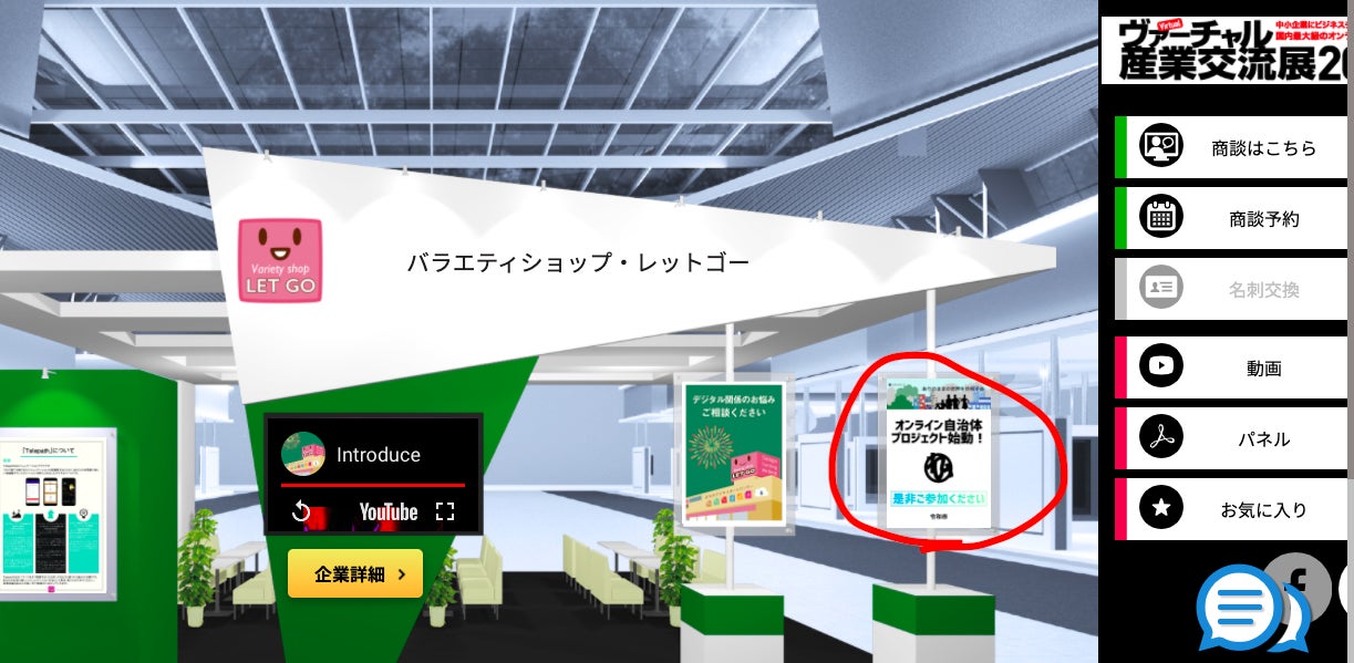 なんと!令和市がヴァーチャル産業交流展に出展しています!↓バーチャル産業交流展https://vsangyo-koryuten.tokyo/今年で23回目となる「産業交流展」は、初となるオンラインでの開催をいたします。3D空間上に展示会場を再現し、直感的な操作で、実際に会場を歩いてるような環境をご提供いたします。産業交流展は、原則として、首都圏(東京都・埼玉県・千葉県・神奈川県)に事業所を有する個性あふれる中小企業などの優れた技術や製品を一堂に展示し、販路拡大、企業間連携の実現、情報収集・交換などのビジネスチャンスを提供することを目的としています。【情報】ゾーンの中にある「バラエティショップ・レットゴー」内の「オンライン自治体令和市プロジェクト」の中で令和市民大学のことが紹介されています!【参考・バラエティショップ・レットゴーについて】バラエティショップレットゴーはデジタルホームセンターです。「日曜大工をしようと思った時に、ホームセンターの店員さんと話しながら、必要なものを揃 えたり、作り方について考えたりするような距離感で、デジタル関連の課題の相談相手になれたら」をテーマにデジタルにかかわる様々な相談を承ります。 ぜひ、足を運んでみてください!【参考リンク】バーチャル産業交流展https://vsangyo-koryuten.tokyo/バラエティショップ・レットゴーhttps://varietyshopletgo.com/令和市民大学https://peraichi.com/landing_pages/view/r-university