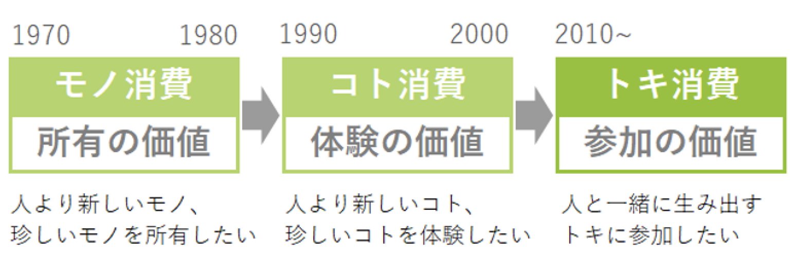 さらに近年、『コト』の体験に留まらず、他人と一緒に生み出す『トキ』へ主体的に参加する点が従来の『コト消費』と異なってきました。