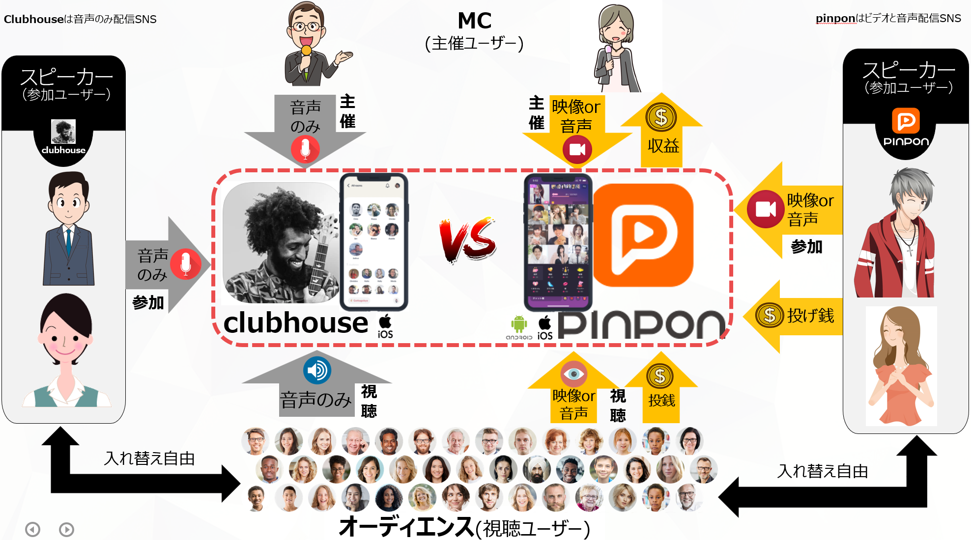 • pinponと流行りのclubhouseを比較してみました。遊び方は両方同じで、どちらもモデレーターによってルームを作成して待機、ユーザーは好きなタイミングで視聴者として入室、会話に興味がれば参加申請してみんなでトークします!大きな違いはpinponは低遅延ビデオ通信技術でタイムラグほとんど感じないグループビデオチャットで会話です。さらに、投げ銭ができて、ただの雑談だけなく、有料のオンラインイベント開催にも可能になります。また、clubhouseと同様に会話が録音・録画されず、その時その場でしか味わえない盛り上がりをリアルタイムで楽しむことです。 もっと見る