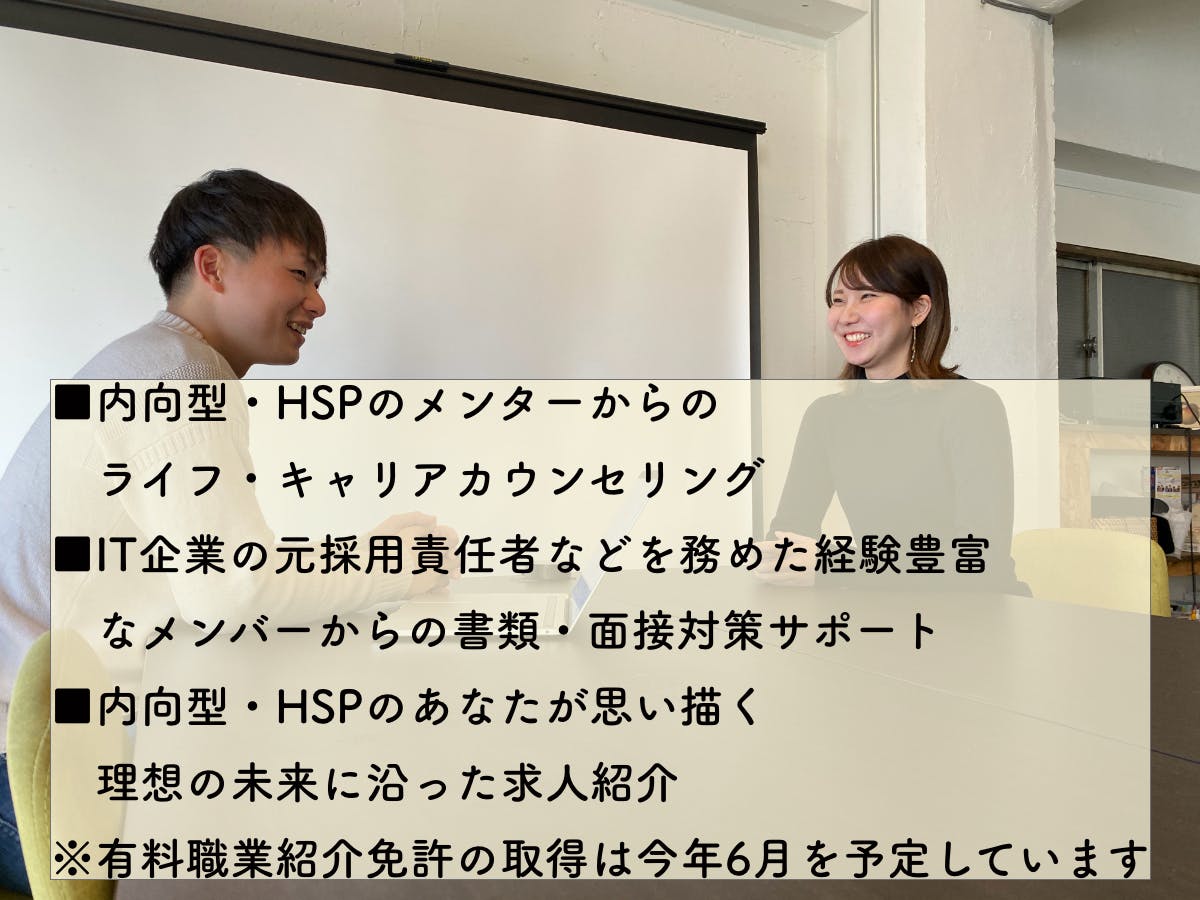 このサービスを通して、私たちは内向型・HSPという気質ゆえにキャリアや人生に悩んでいる方が、 「このままでいいんだ」と心から思え、明日がちょっと楽しみになる、そんな居場所と未来を提供していきます。
