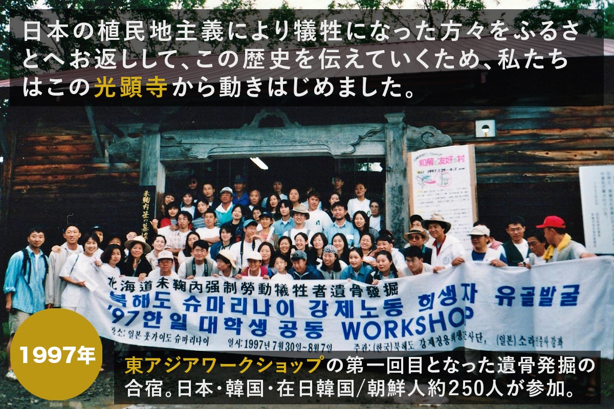 代表の殿平善彦と韓国の鄭炳浩(チョン・ビョンホ、韓国漢陽大学文化人類学科名誉教授)の偶然の出会いをきっかけに、日本・韓国・在日韓国/朝鮮人の大学生などが合宿をしながら遺骨発掘をする「日韓共同ワークショップ」が始まりました。