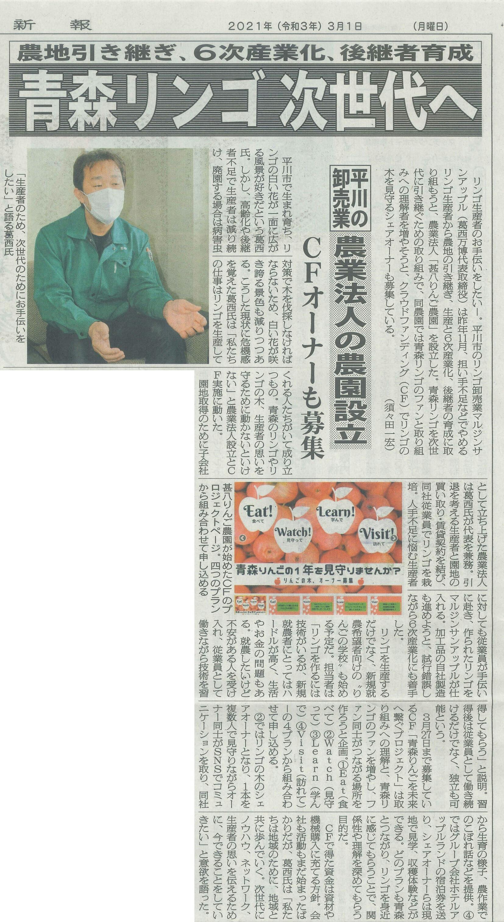 本日3月1日の陸奥新報に大きく掲載していただきました!