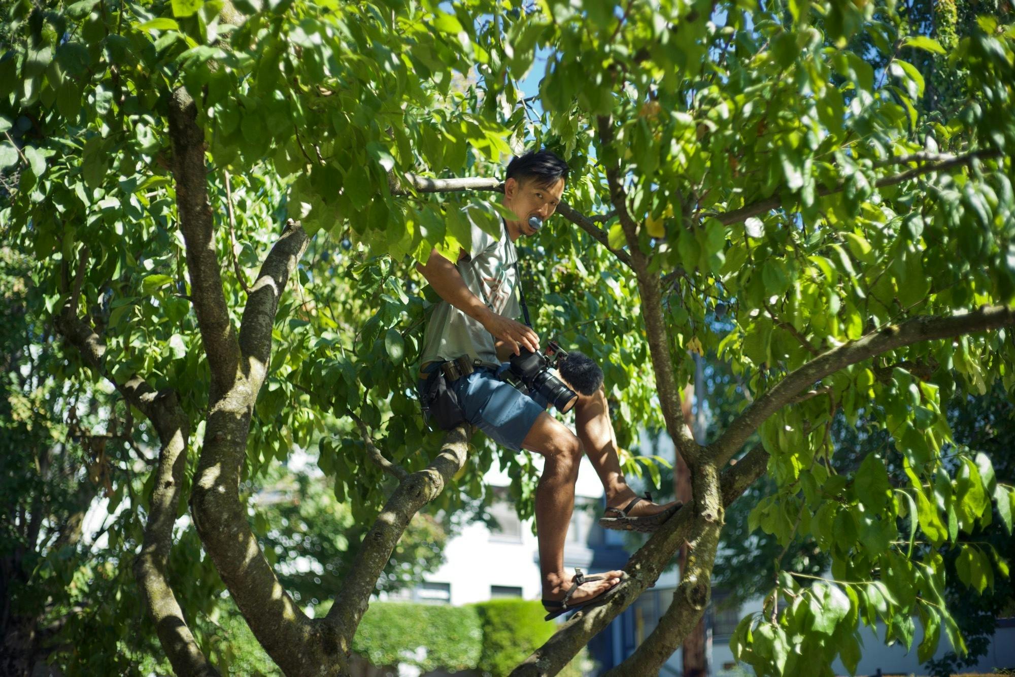 身軽に木に登って撮影するノブさん。さすが、クライマー!