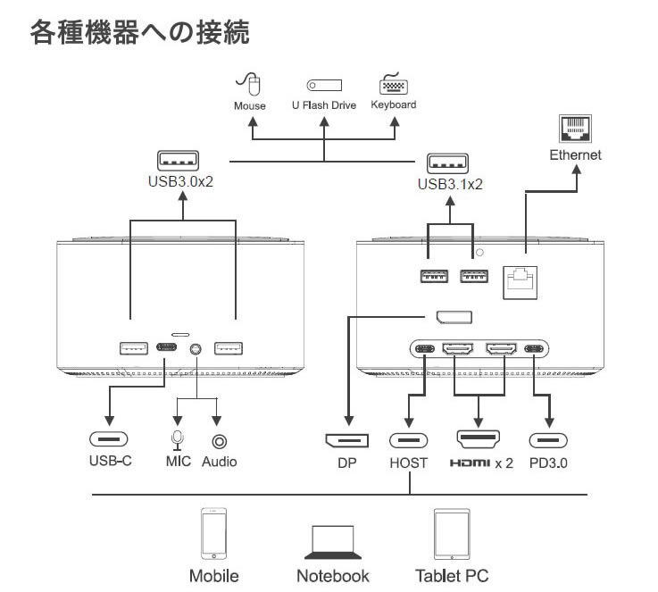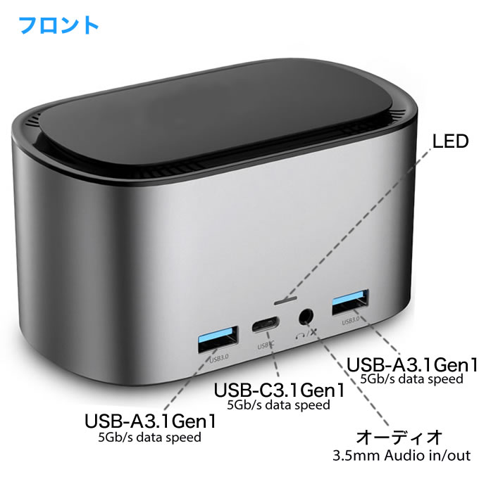 このUSB-Cドッキングステーションは、USB-CインターフェイスでPCを複数のデバイスに拡張出来るようにデザインされています。