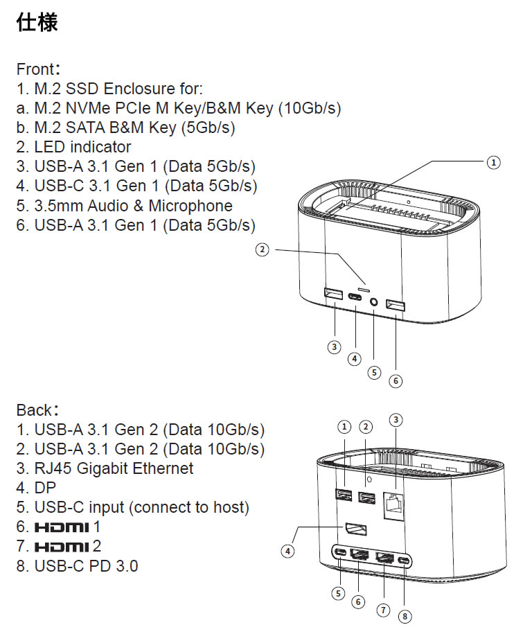 3.背面のUSB-C(No.8ポート)は、ホストコンピューターを充電し、ドッキングステーションに電源を供給するように設計されています。