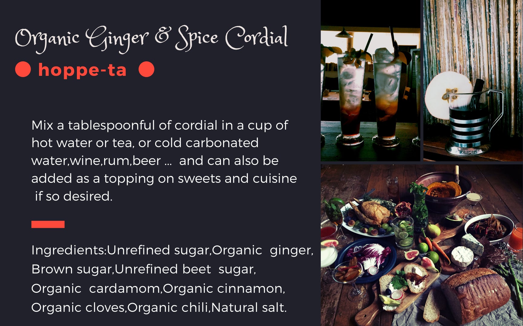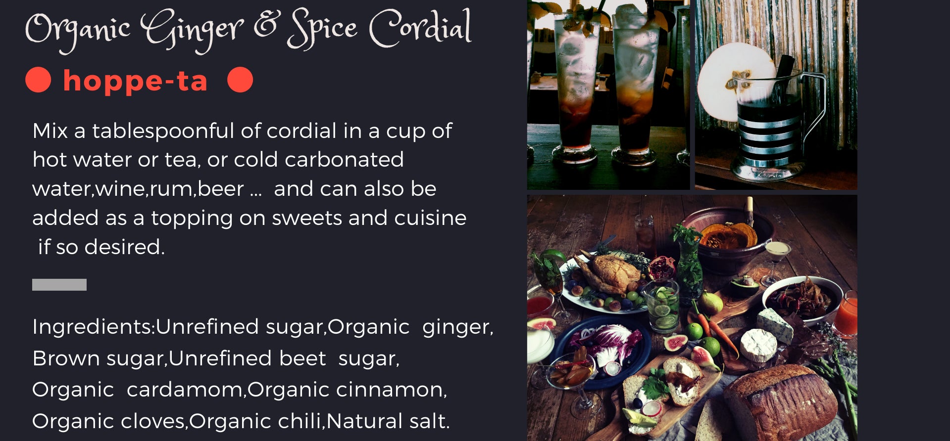 おかげさまで、カフェで一番人気だった"刺激的な自家製ジンジャーエール”と"オーガニックスパイスティ”は、こちらのほっぺたの生姜のみつを、無糖炭酸や紅茶で割ったものです。また、こちらのシロップを使った料理(魯肉飯 ルーローハン)や デザート(生姜杏仁、スパイスチーズケーキ)、アルコール(濃厚なシャンディガフ、スパイスモヒート、スパイスサングリア ... )もカフェでお出ししていました。(リターンには、レシピをおつけしております。)