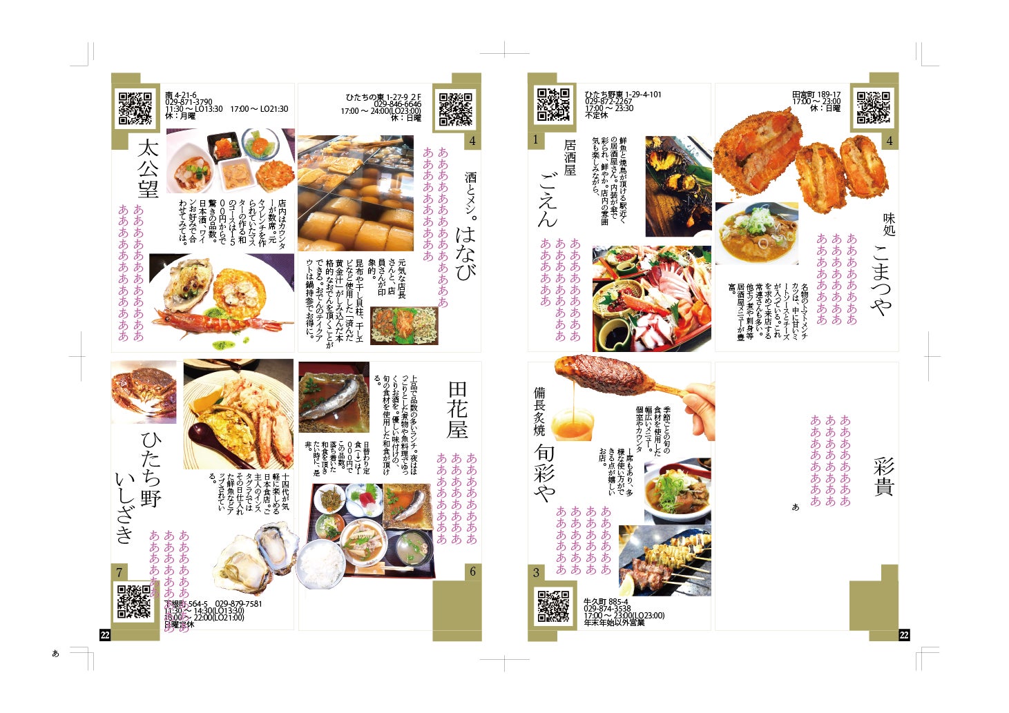 作成段階の画像第二弾です。飲食店さんの画像をいろいろ見ながら、自分がお店に行った時見た風景を思い出しながら作っています。前回の62件から100件まで増えたのですが、想像はしていましたが、大変です大変ですが、楽しい!手に取ってくださった方に楽しんで頂けるようなフリーペーパーに出来るよう頑張ります!