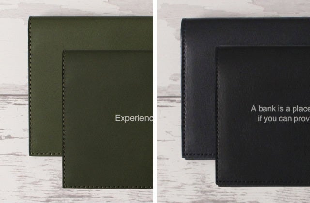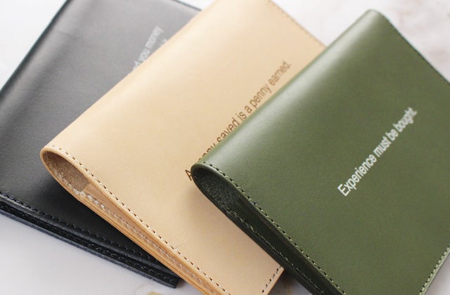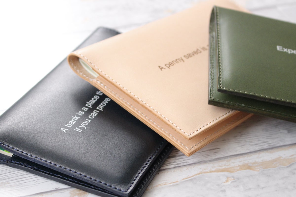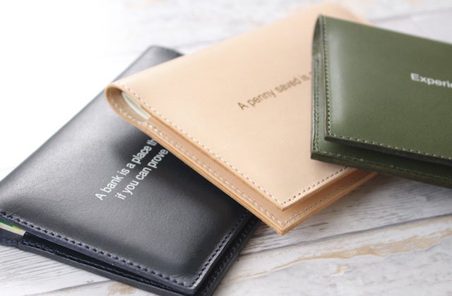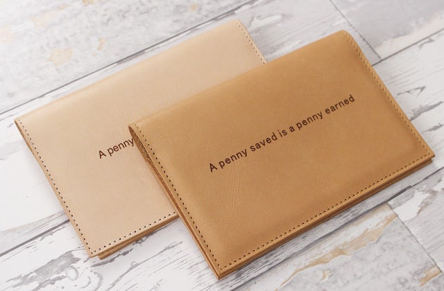 国産のヌメ革に貯金やお金に関するキャッチコピーを刻み