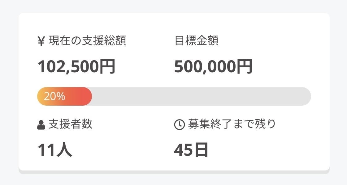 みなさまご支援とご声援をいただき誠にありがとうございます!クラウドファンディングですが、ついにあと2日となりました!4月11日 23:59にてこのプロジェクトは一区切りを迎えます><。およそ3ヶ月もの間、多くの方からのご声援やご支援をいただけたことで、僕らは最後まで諦めずにここまで駆け続けることができました!!SNSでシェアをしてくださる方がいたり、応援のメッセージをいただいたり、チラシを設置してくださるお店があったり、感謝し尽くせないほどの温かみを毎日毎日感じました♪本当に本当にありがとうございました!!!いよいよ残りあと2日!!現時点では44%ですが、まだまだ諦めません!!どうかどうか最後までもうひと押しのご支援とご声援を宜しくお願い致します><。