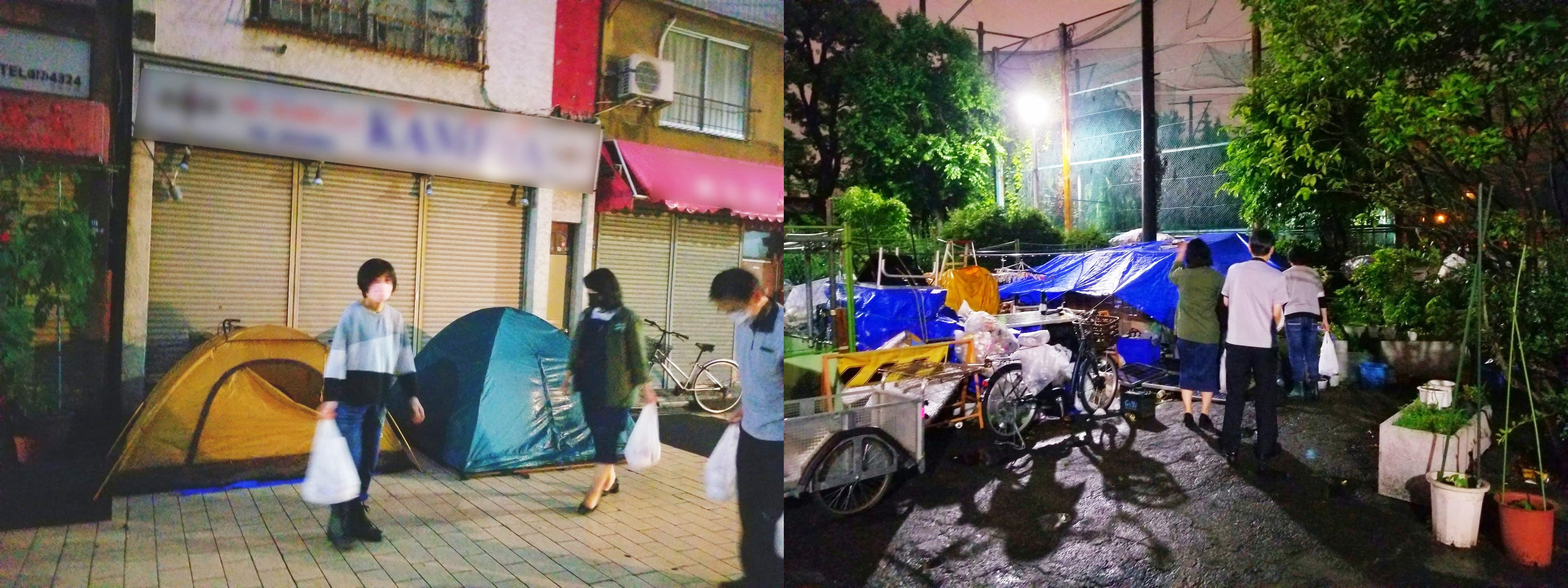 私たちが提供したいのは物的(宿泊、食料含む)サポートと生活健康相談のための人的サポートです。まず物的サポートについて、野宿の形態には大きくわけて2つのタイプ、固定層と移動層があり、それぞれにあった形での支援を提供します。固定層は一定の場所にテントを設置して生活する人たちですが、一度テントを空けると不在中に撤去され、その場所に帰ってこられなくなるという事情があります。移動層には2タイプあり、荷物を預けて夜にテントを設置して野宿をする人と、テントがないので段ボール等で寝床をつくって野宿をする人です。