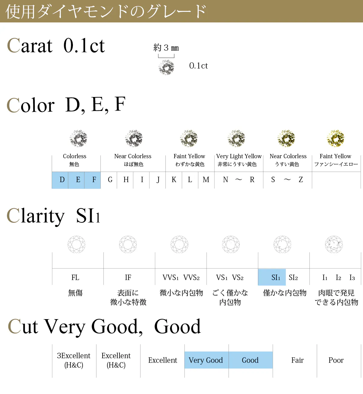 弊社で購入したダイヤモンドを鑑定に出し、D,E,Fのカラーのダイヤモンドだけを厳選し、地金の品位にもこだわり、K18でおつくりしています。