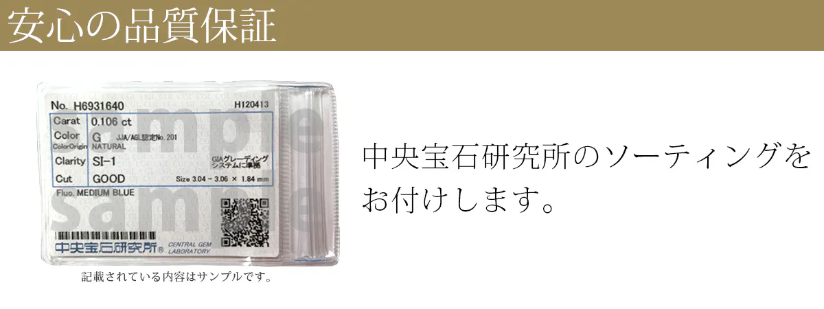 ダイヤモンドのグレードは宝飾業界の人がルーペで見ても判別が難しいほどわずかな違いで格付けされています。だからこそ、品質を確約できる保証をお付けしたい、それには宝飾業界で最も信頼がある中央宝石研究所のソーティングがをお付けすることが一番だという結論に達しました。