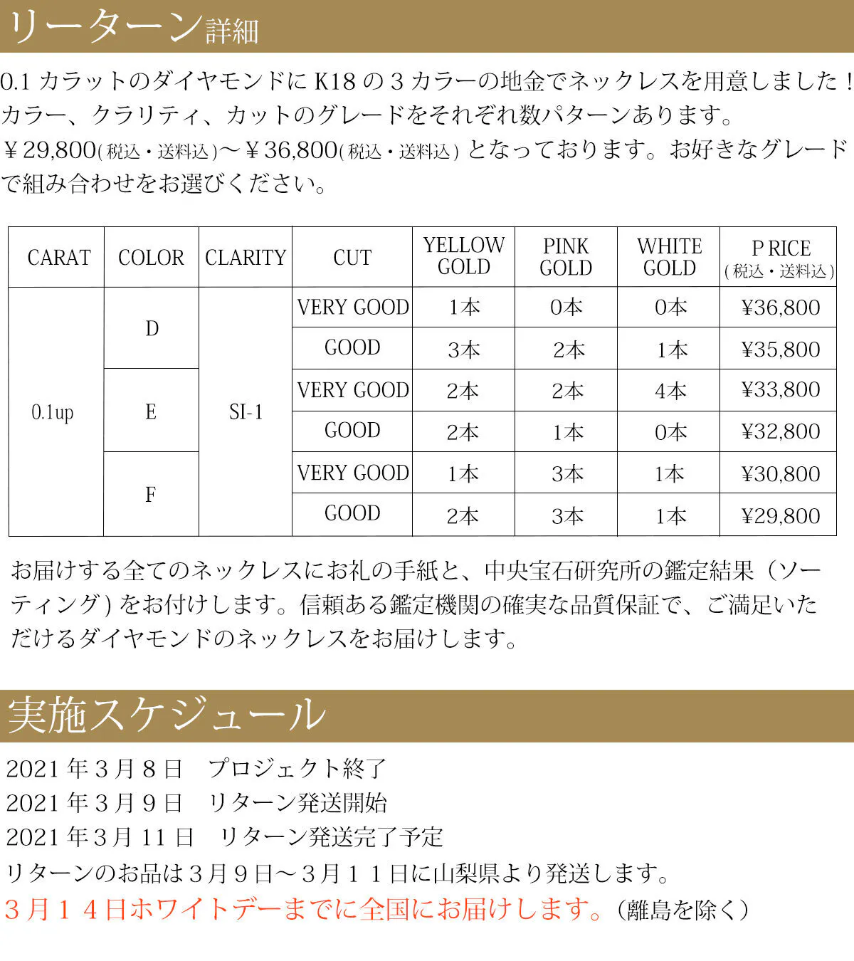 2021/03/07 17:43日頃からご支援いただきありがとうございます。さて、このプロジェクトも残り1日となり、ご支援いただきました皆様のおかげで目標達成率299%となりました。只今、ネックレスを丁寧にボックスに入れて、ギフトのリボンをかけて、手書きのお手紙を書いて、ご支援いただいた皆様へお届けするリターンの発送準備を進めております。ホワイトデーの3月14日までに日本全国の皆様にお届けできますように発送します。【本当に美しく輝く最高品質のダイヤモンドK18ネックレスをお届けしたい】プロジェクト終了までスタッフ一同邁進していきますので応援のほどよろしくお願い致します。 もっと見る