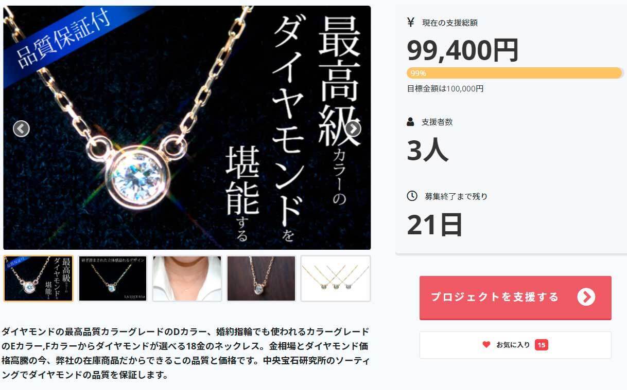 日頃からご支援いただきありがとうございます。さて、このプロジェクトも残り21日で目標達成率99%となり、目標達成まであと1%となりました。ホワイトデーの3月14日までに日本全国の皆様にお届けできますように発送可能です。今後も、【本当に美しく輝く最高品質のダイヤモンドK18ネックレスをお届けしたい】プロジェクト成功へと邁進していきますので応援のほどよろしくお願い致します。