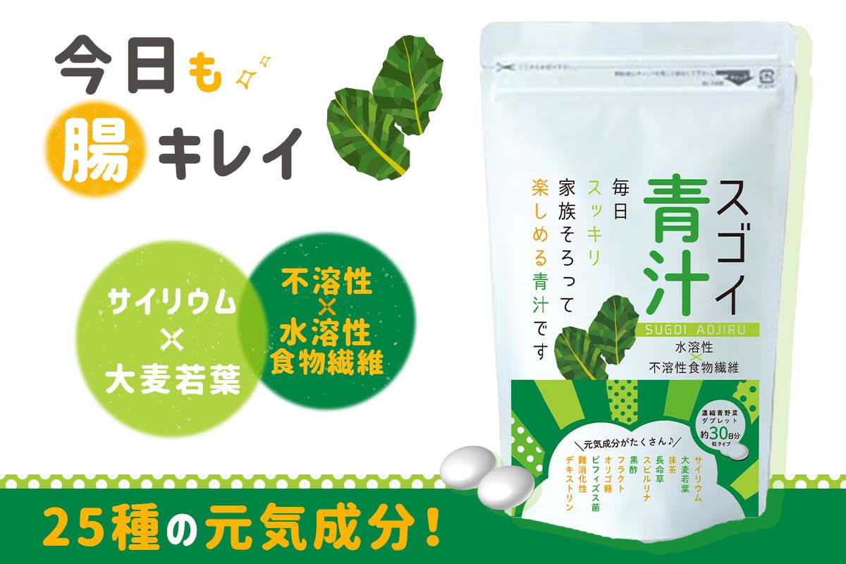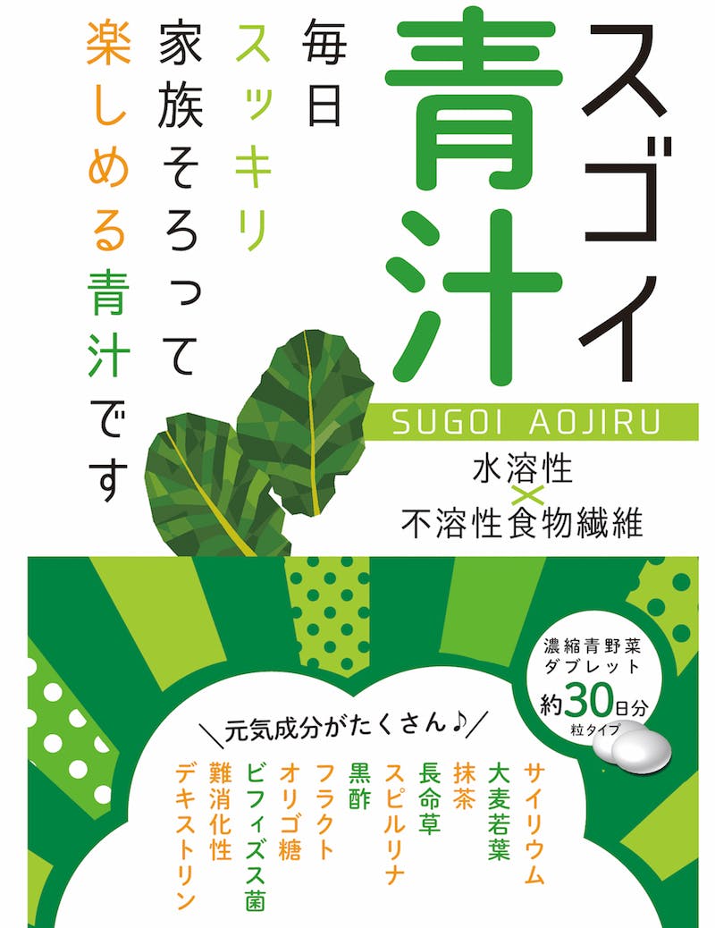 自宅にいるとつい、お菓子類を食べてしまったり、インスタントラーメンなどで済ませたりして、野菜不足で思うように食物繊維が摂れない方も多いかと思います。そんな方に、「スゴイ青汁」は、野菜不足のお手軽な解消方法をご提案します。タブレットタイプなので、外でも家でもとても飲みやすく、続けやすいのが特長です。