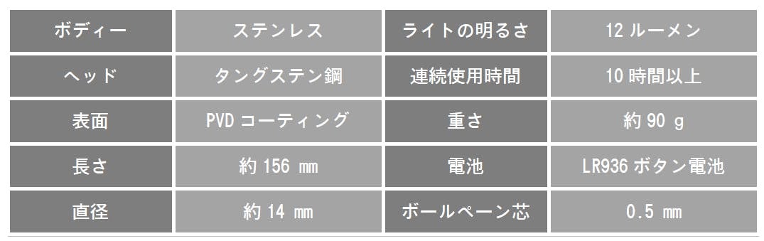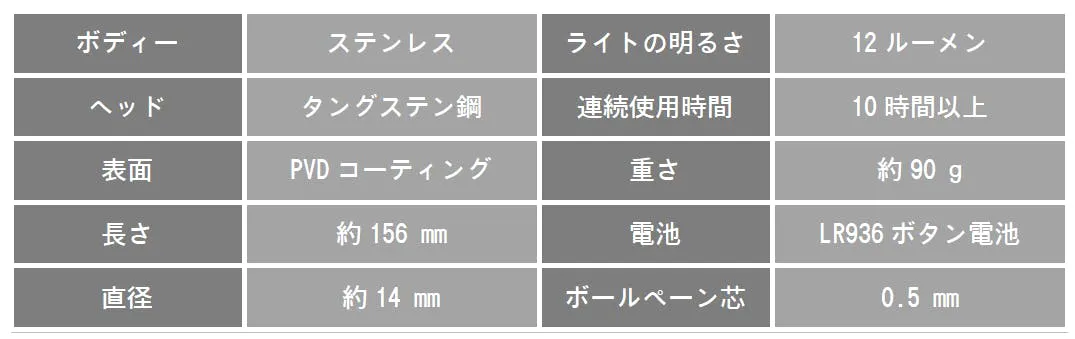 とてもなめらかに書けるボールペン芯を搭載し、握りやすいボディーと重厚感のあるステンレス素材は使い心地抜群です。普段は筆記具として携帯し、サインやちょっとしたメモに便利です。