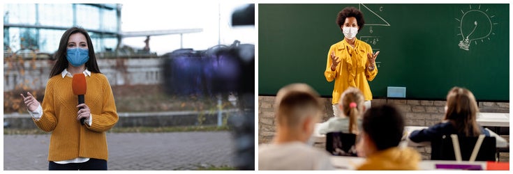 報道関係者など、仕事で話すことが多い方もフェイスシールドを着用すれば、有効に酸欠を防ぎ、また、声が籠らず、表情も聴衆に伝わりやすくなります。