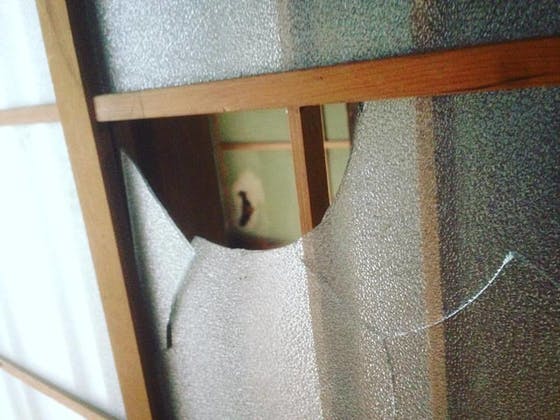 写真は、こどもが来てくれて嬉しくなり過ぎて興奮した息子がブロックおもちゃの人形を投げて割ったガラスです。