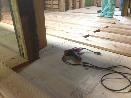 写真は、床張りワークショップの様子です!まだ床張りするべき場所はいっぱいあります....笑